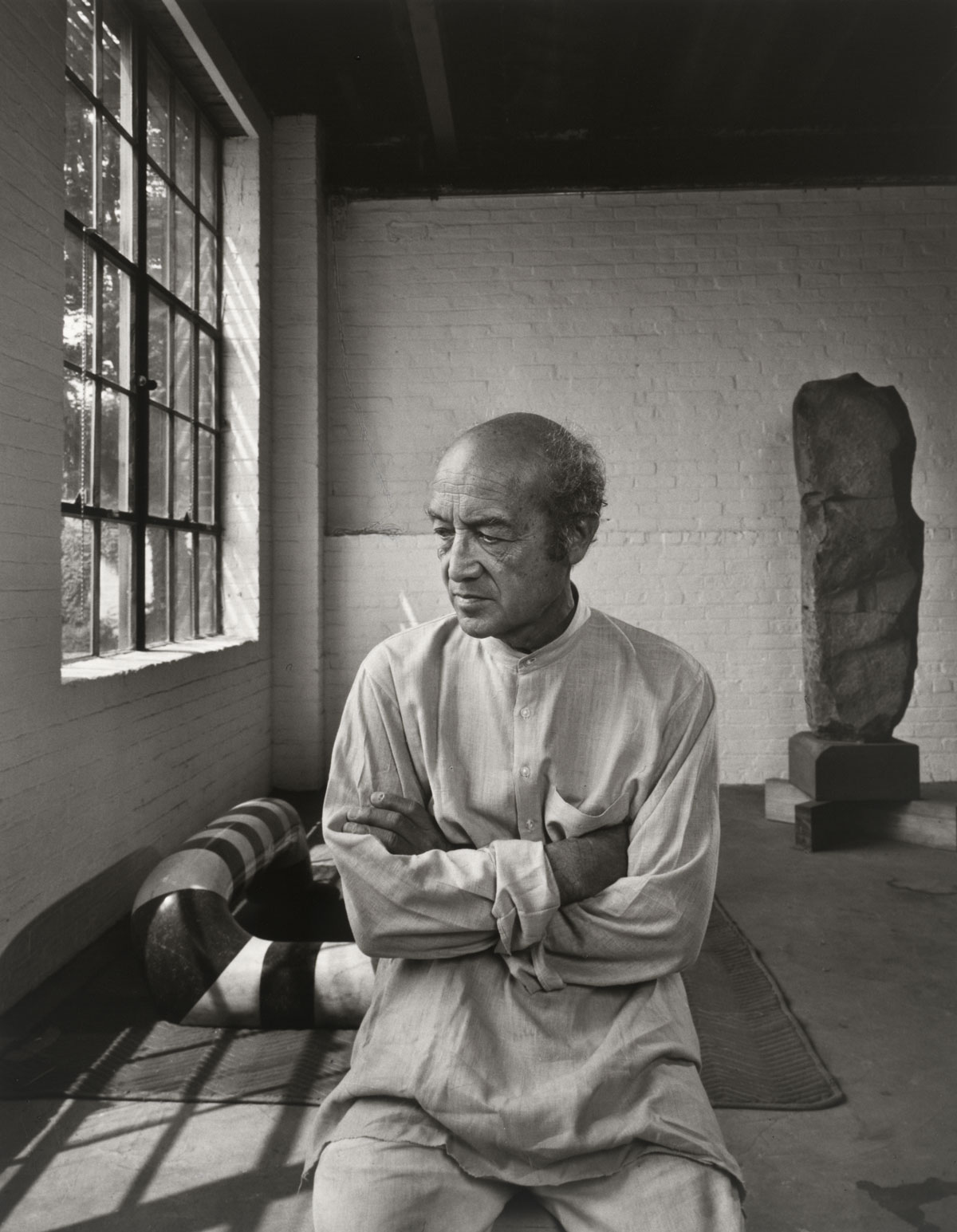 Upon his return to New York, Noguchi took a new studio in Greenwich Village. Throughout the 1940s, Noguchi’s sculpture drew from the ongoing surrealist movement; these works include not only various mixed-media constructions and landscape reliefs, but lunars – self-illuminating reliefs – and a series of biomorphic sculptures made of interlocking slabs. The most famous of these assembled-slab works, Kouros, was first shown in a September 1946 exhibition, helping to cement his place in the New York art scene.