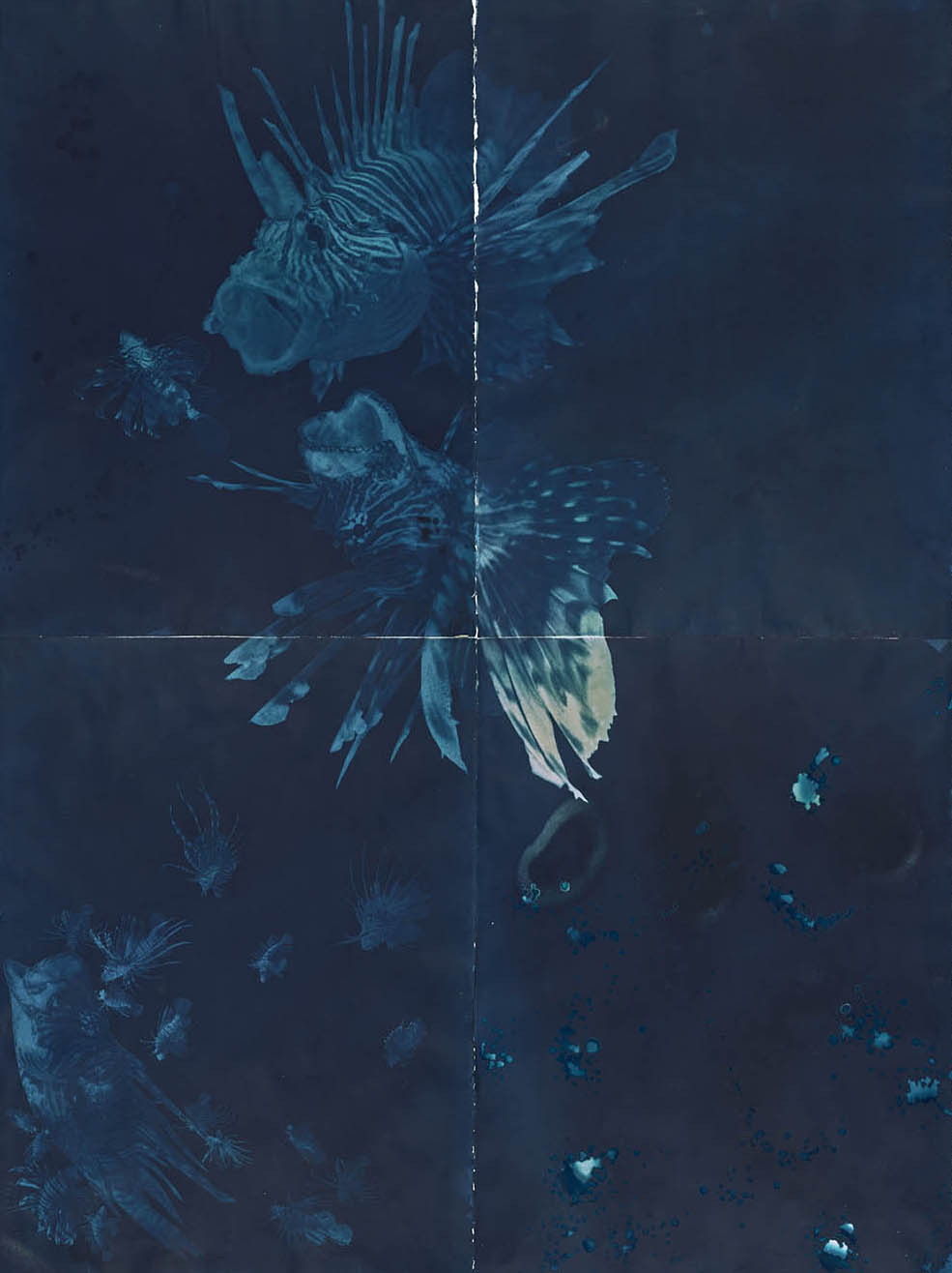 CJ Heyliger makes his desert landscapes in many different places, resulting in images that reveal the sites’ alien beauty and hallucinatory detail. His approach to mapping the terrain on film reduces it to the medium’s most basic elements – simply light and time. Here, he magically transforms a trail of broken glass into a constellation of stars in a night sky, and in North, East, South, West, his multiple exposures of a spiky yucca create a wildly spinning whirligig.
