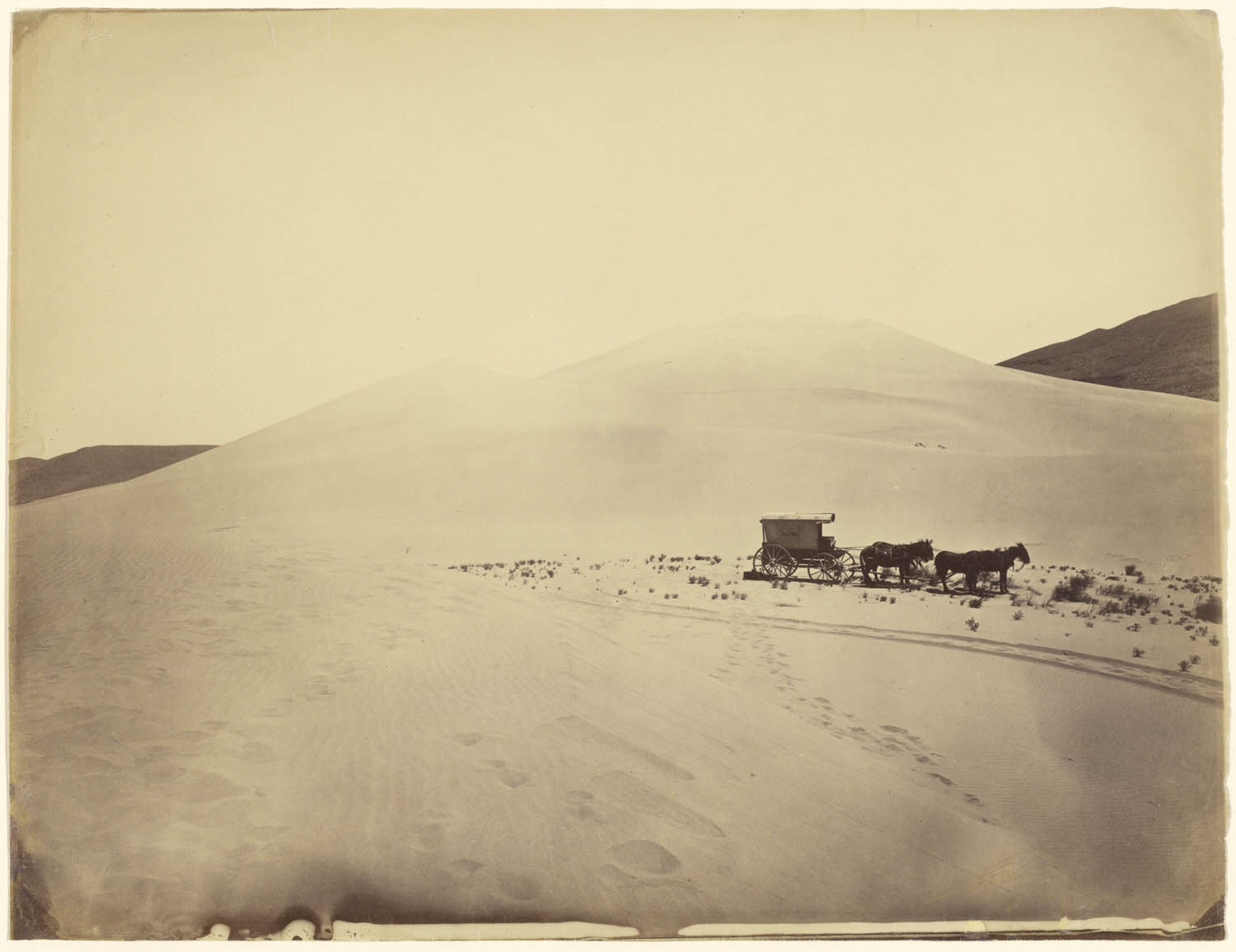 Eadweard Muybridge first came to Yosemite in the 1860s. Capitalising on the growing popularity of wilderness landscape subjects, he stayed for six months, making large-format albumen prints and stereo views. Hoping to compete with Carleton E. Watkins’s earlier grand vistas, he returned in 1872 with a mammoth-plate camera. Often, Muybridge shot his atmospheric images from unusual perspectives, with sharp contrasts between foreground and background, light and shadow. This is evident in this photograph taken from Union Point, which provided a closer view of the valley and a greater sense of three-dimensional space than the better-known Glacier Point above.