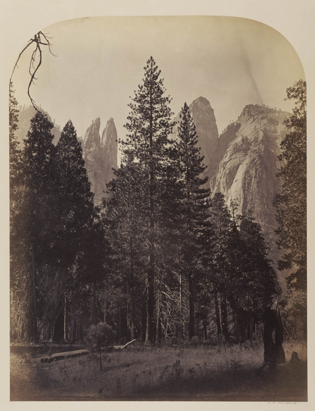 Carleton E. Watkins took this photograph from the floor of Yosemite Valley while working for the California State Geological Survey in the mid-1860s. It is a more intimate and less sweeping view than the photograph Watkins self-described as the “best general view of Yosemite” (below), which presents the most recognisable features of the landscape.