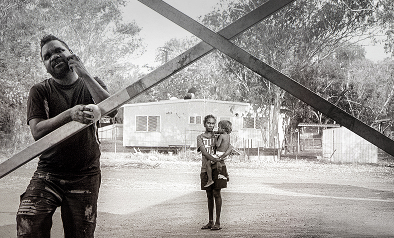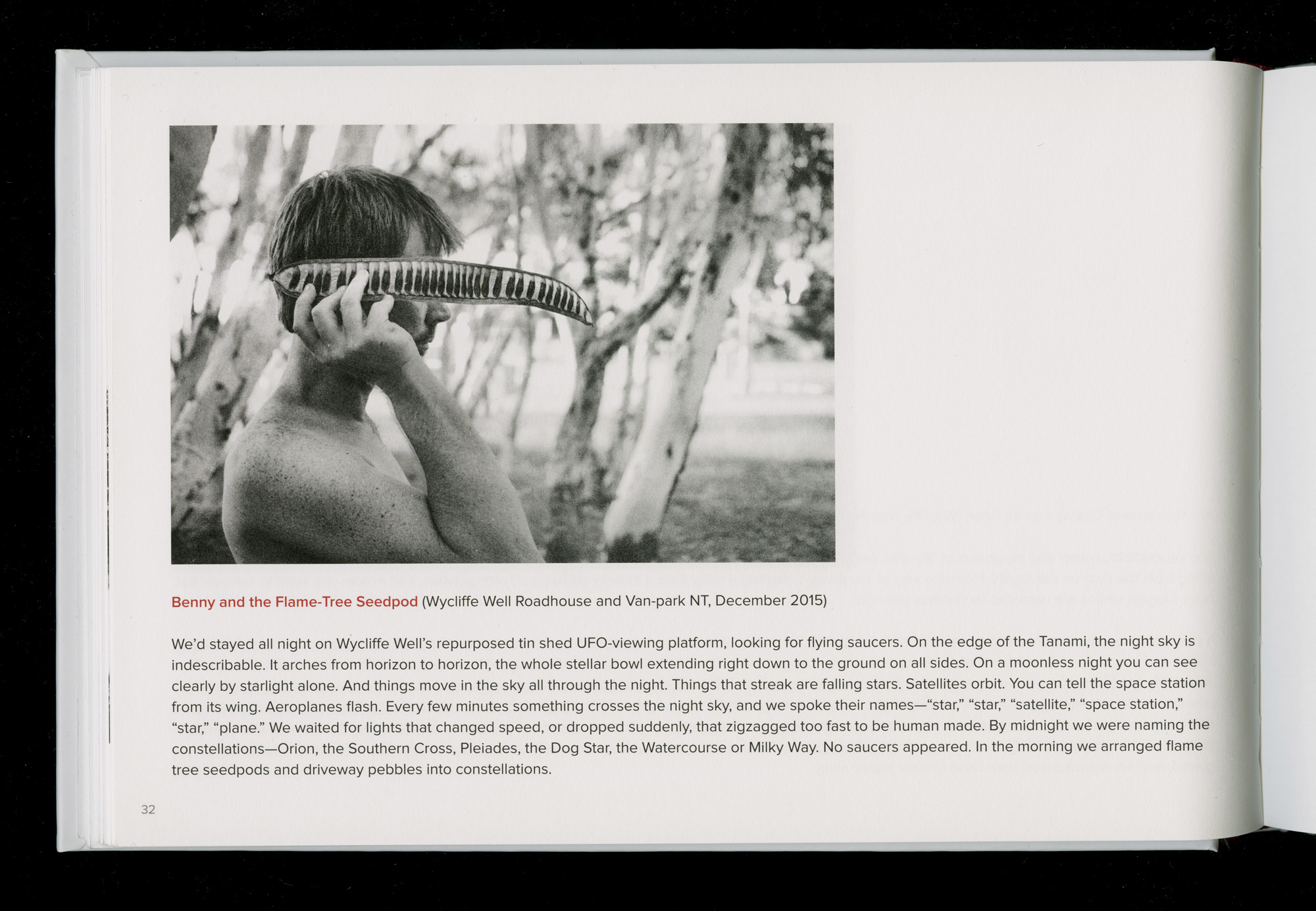 In Evans’ current exhibition, Standing Stone, the artist has used rocks from the plains nearby Wurdi Youang to recreate a constellation of markings found on her own body. The layout for these marks was initially realised on an inverted black and white photograph Evans took of her back: in this image, her usually pale skin appears darker than its illuminated blemishes. Using a biro and ruler, moles and freckles were connected with diagrammatic lines, just as planets, stars and dark nebula are drawn to one another in astronomical illustrations. In the exhibition, this exact configuration of blemishes is re-presented using volcanic rocks in a sculptural installation. Across the walls and floor, each point is connected with a gleaming line of transparent cello-tape.