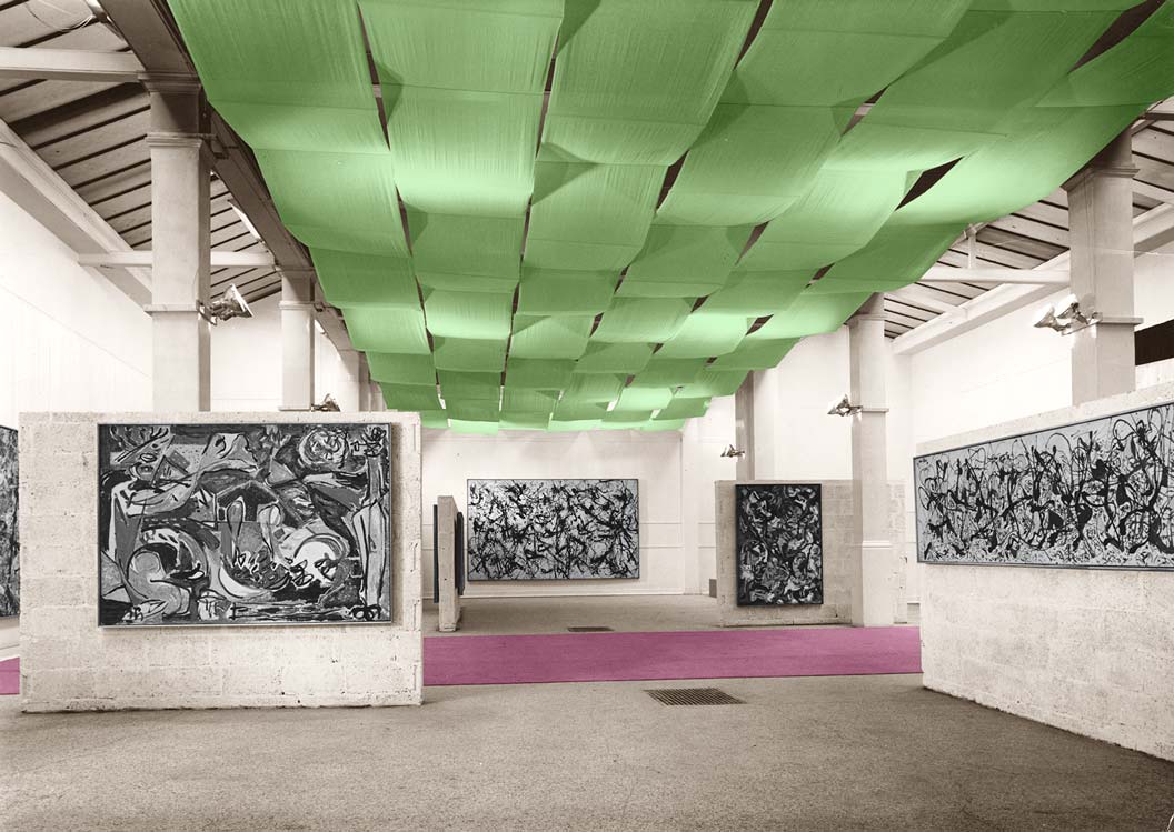All of this emphasises the contrast to today’s widespread notion of the exhibition space as a “white cube”. m.n.o.p. (2013) presents processed installation views of the presentation of the Museum of Non-Objective Painting in New York (now the Solomon R. Guggenheim Museum) with works by Wassily Kandinsky, Rudolf Bauer, and other artists from the collection, which took place in the first museum building on 24 East 54th Street in 1948. The motifs from w.g.l. (2017) were taken from the exhibition‚ Jackson Pollock 1912-1956, one of the most important exhibitions in terms of the mediation of contemporary art, which was presented at the Whitechapel Gallery in London in 1958.