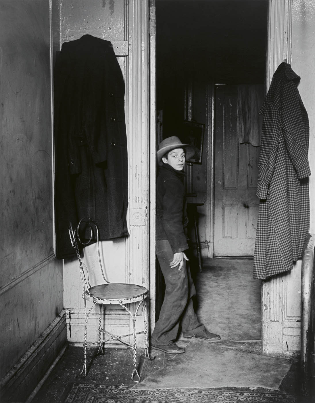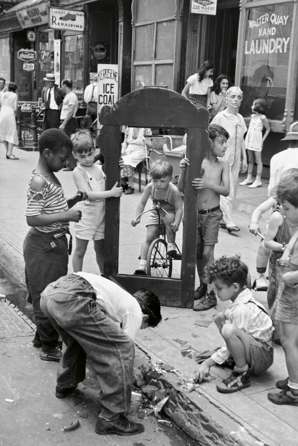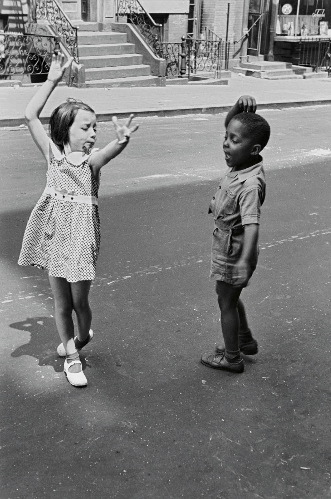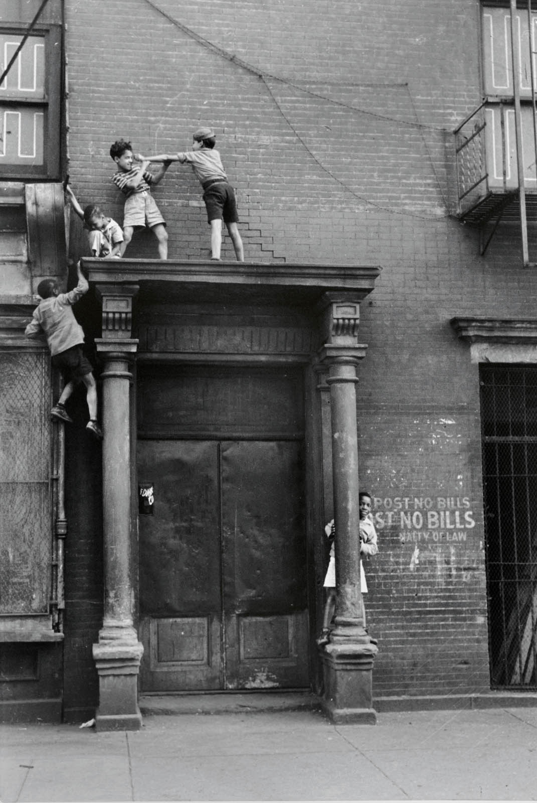 an environment whose “size and varied character constantly forces into the open material for my camera.” The working class, immigrant neighbourhoods she frequented – where adults chatted on stoops, mothers and children leaned out of windows, and children were left to their own devices – proved to be an especially fertile ground for her work.