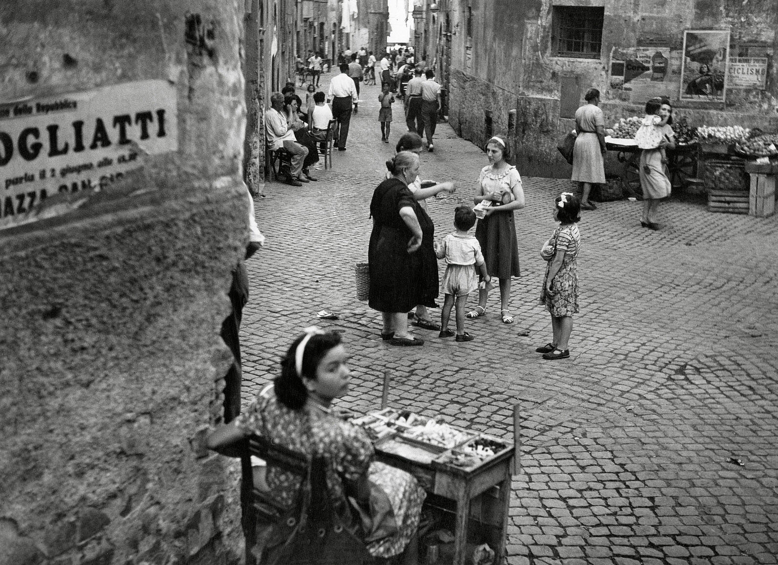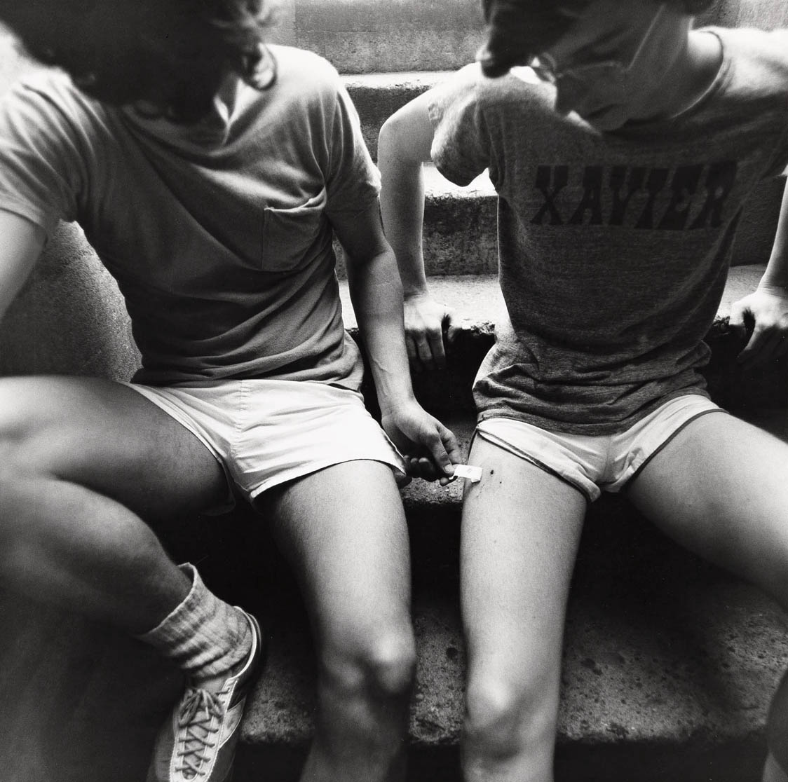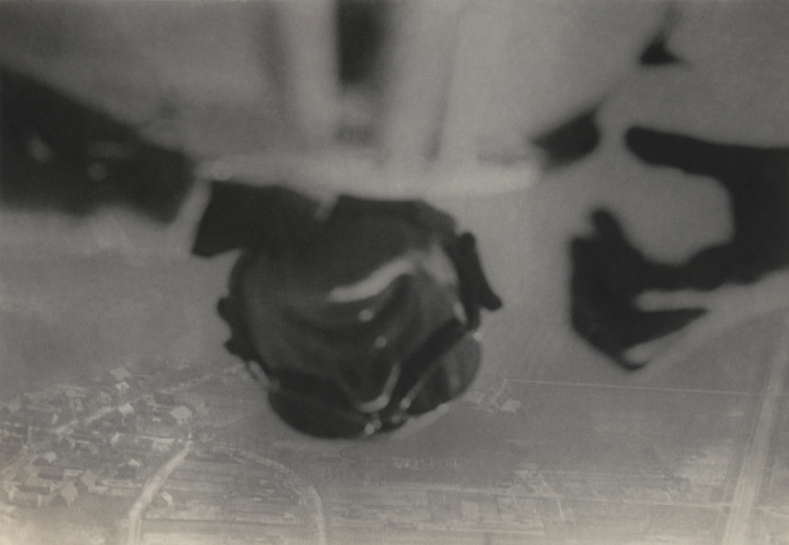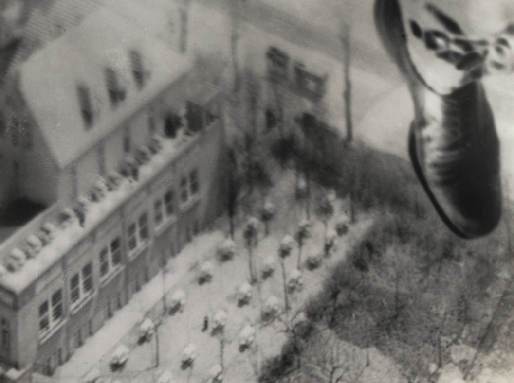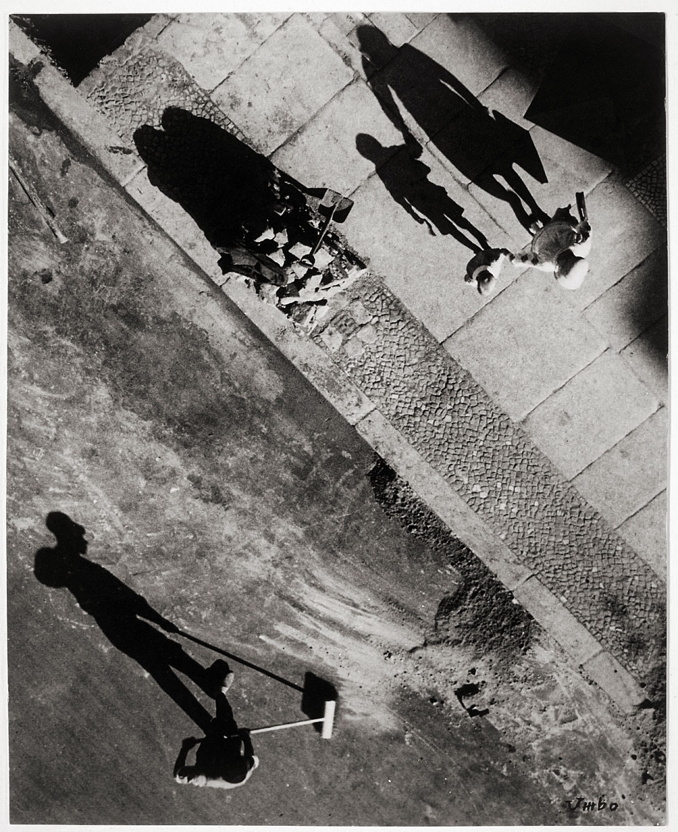 After he left the Bauhaus, Umbo worked as assistant to Walther Ruttmann on his film Berlin, Symphony of a Great City 1926. In 1928, photographing from his window either very early or very late in the day and either waiting for his “actors” to achieve a balanced composition or, perhaps, positioning them as a movie director would, Umbo exposed three negatives. He had an old 5 by 7 inch (12.7 by 17.8 centimetre) stand camera and a 9 by 12 centimetre (3 9/16 by 4 3/4 inch) Deckrullo Contessa-Nettle camera, but which he used for these overhead views is not known, as he lost all his prints and most negatives in the 1943 bombing of Berlin. The resulting images present a world in which the shadows take the active role. Umbo made the insubstantial rule the corporeal and the dark dominate the light through a simple but inspired inversion: he mounted the pictures upside down (note the signature in ink in the lower right) .