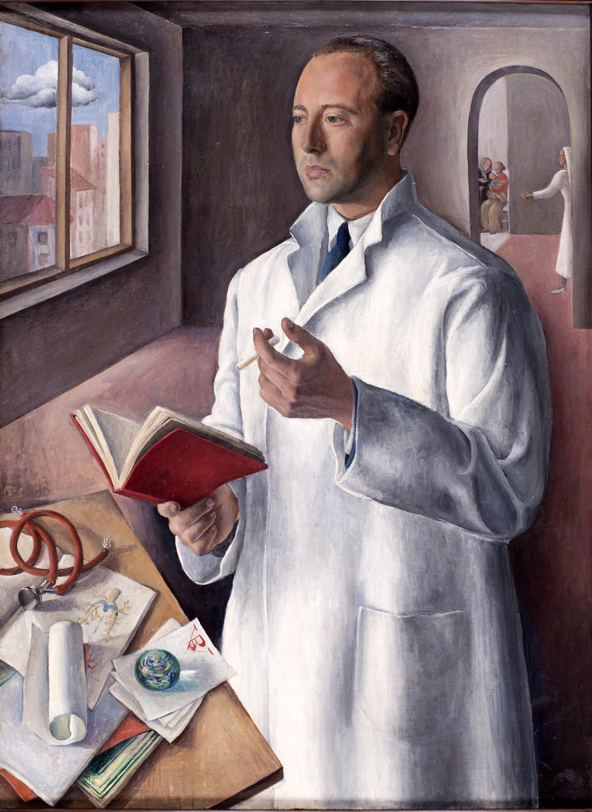 Rosario de Velasco was part of the “return to order” movement in Spain which was a style that combined tradition and modernity, associated with a revival of classicism and realistic painting. The paintings are stylish with clean lines and finely honed forms. Among other influences, they evoke Cubism in the tilting of perspective and De Chirico in the slightly twisted perspective of the architectural landscape scenes (for example, see Portrait of Doctor Luis de Velasco (Retrato del doctor Luis de Velasco) c. 1933 below) … while also incorporating magic realism (a style which presents a realistic view of the world while incorporating magical elements) in their story telling.