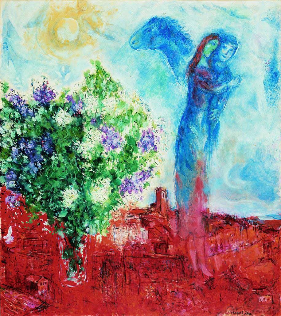 Flowers and animals are a constant presence in his paintings, enabling him on the one hand to overcome the Jewish interdiction of human depiction, while on the other becoming metaphors for a possible world in which all living beings can live in peace as in Russian mediaeval culture. In the words of Giovanni Arpino: “The soul of Chagall is a bleating soul, as mild as it is invincible because it escapes the horrors, the snares, the outrages … His paradise is an earthly Otherworld that encompasses the simulacra of life, a physical place that becomes metaphysical precisely because we have all killed it during daily life.” His art constitutes a sort of metissage [mix] between cultures and traditions. The fundamental key to his modernity lies in his desire to transform contamination into a value, a work of art into a language able to ask questions that have as yet been left unanswered by mankind.