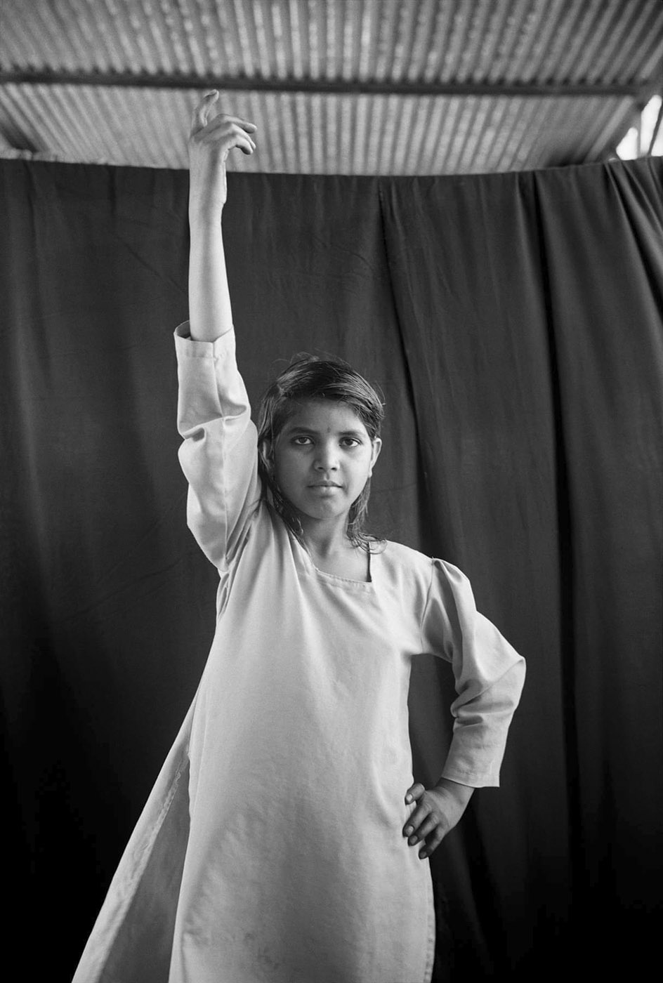 “I created a photo-stall for anyone to come in and have their portrait taken, and later buy the silver gelatin print at a subsidised rate if they wished. I had a few basic props and backdrops, whatever we could get from the local town studio and cloth shop on a very limited budget, but it was fairly minimal, and since it can get windy out in the desert everything would keep getting blown around, or periodically struck down. The light was the broad, even light of a desert sky, filtered through the cloth roof of our tent. Many of the more striking props – like the peacock and the paper hats – were brought in by the girls themselves. Girls came in, and decided how and with whom they would like to be photographed – best friends, new friends, sisters, the odd younger brother who had tagged along, girls with their teachers, the whole class, the local girl scouts. Some of those who posed for the pictures went on to learn photography in the workshops that we started in May of that year, and two years later they photographed the fair themselves.”