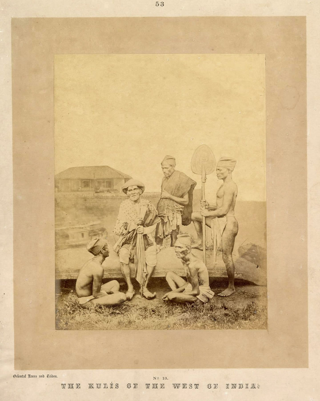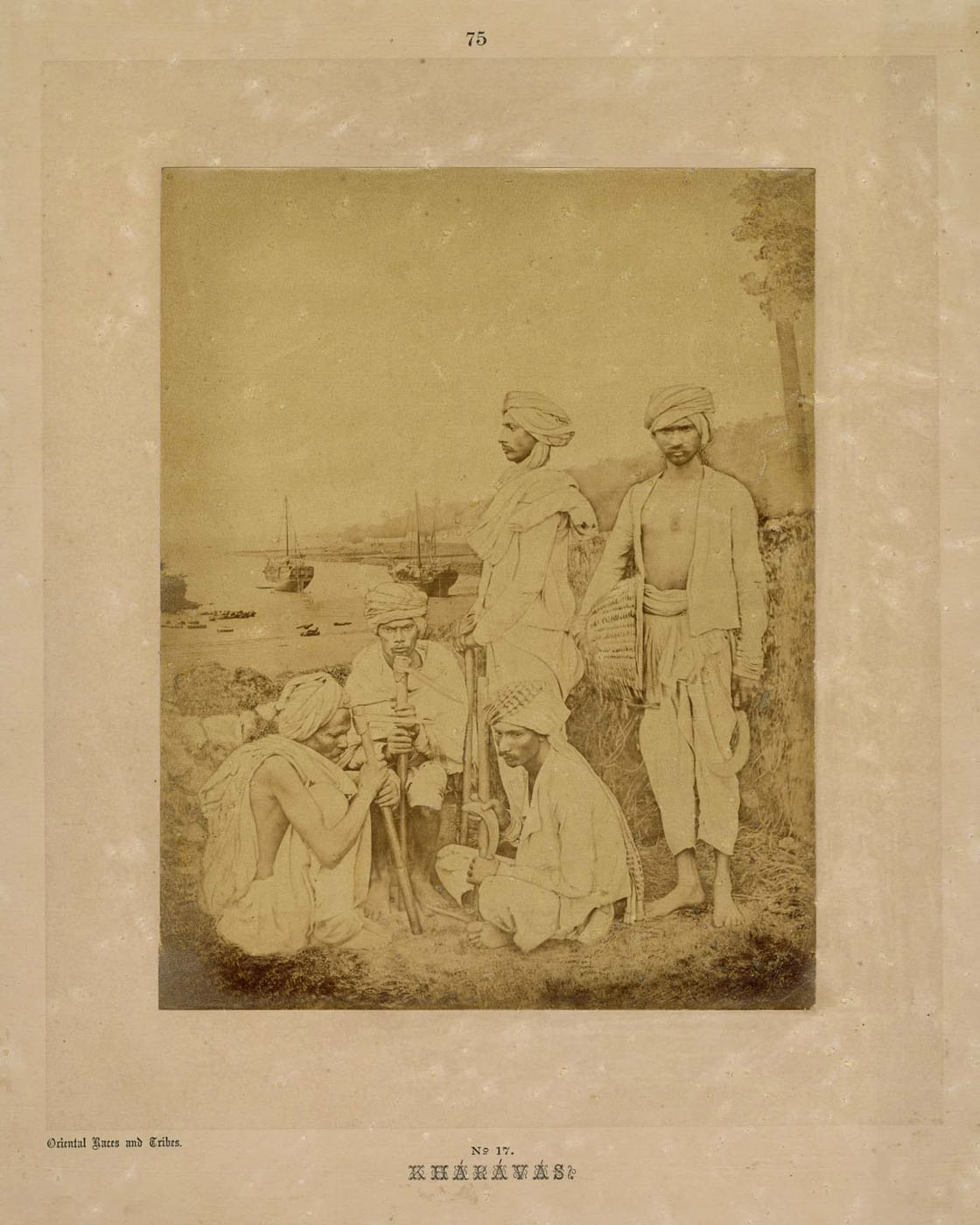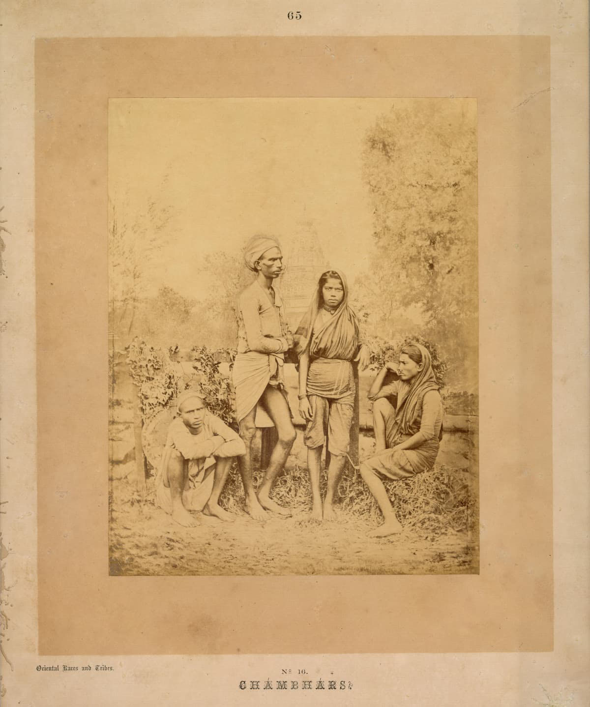 Four members of the Chambhar community, historically associated with leather work, pose for an outdoor portrait by William Johnson, co-author and photographer of two-volume collection of albumen prints The Oriental Races and Tribes, Residents and Visitors of Bombay. The photographs with letter-press description are largely considered to be the first published ethnographic study of Indian people to use photos as well as written descriptions.