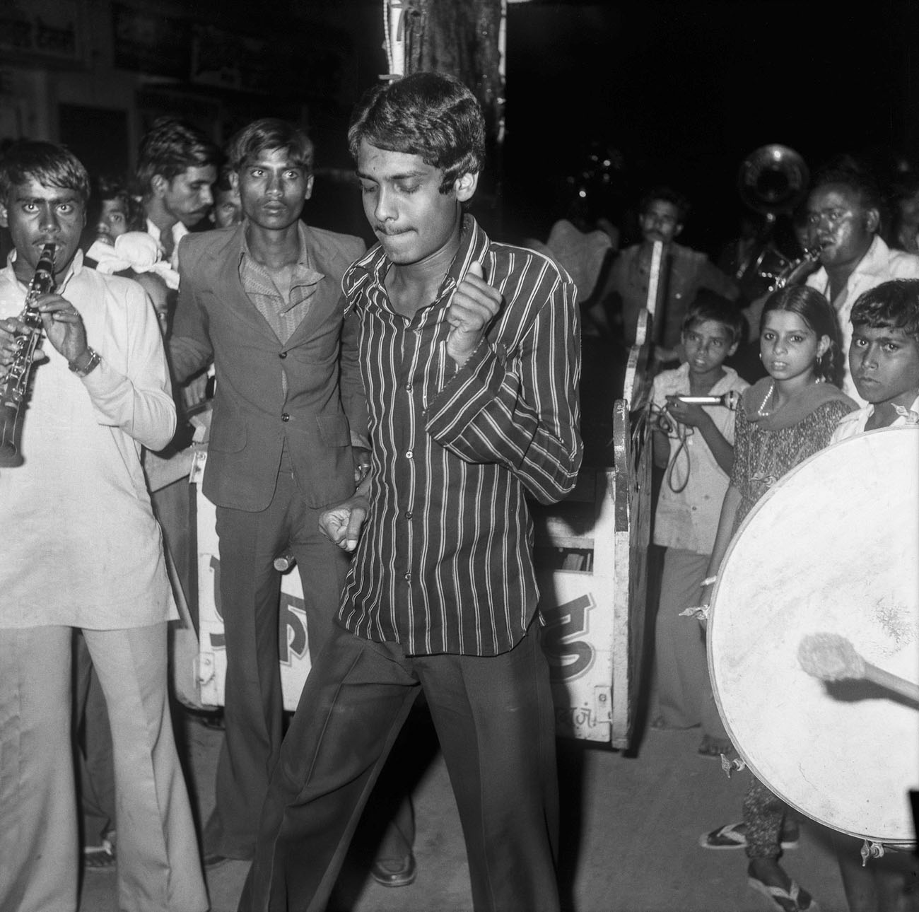 There were times when Punjabi ventured out of his studio and into both nearby streets and remote villages, into temples and bars and through wedding processions and funerals. Having started out working weddings, Punjabi had become a keen-eyed and quick-footed photographer, rarely without a camera when the moment demanded it. These outdoor images provide a crucial bridge between the regulated and consciously arranged dream-world of his studio and the teeming human drama of everyday life just outside its doors.