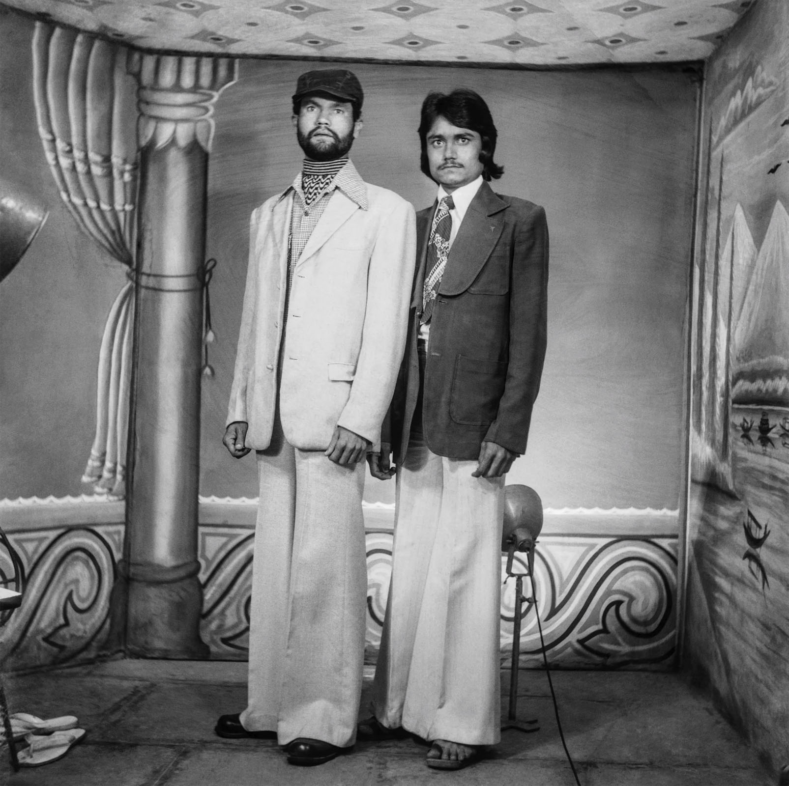Two friends, dressed rather stylishly, stand in a slight three-quarter profile while looking directly into the camera. Punjabi often offered props such as sunglasses and hats to his sitters, however the origin of the pieces of clothing featured here – including the flared trousers and blazers – remains unclear. One interesting clue, likely intended to be cropped, is the pair of slippers near the bottom left of the frame. Only one of the men is wearing shoes, suggesting that the shoes are props and the slippers belong to him.