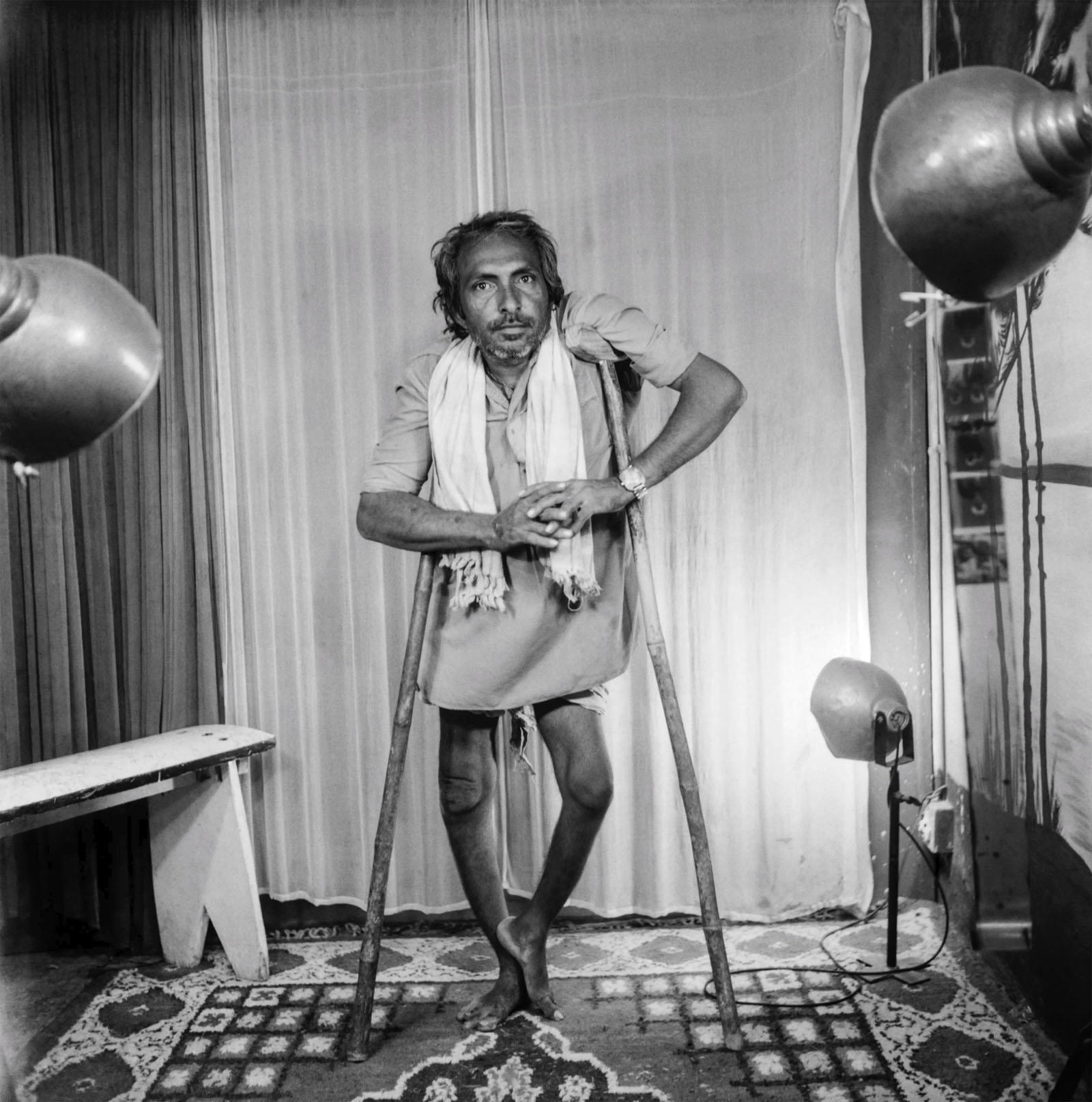 Unlike the other administrative images in Punjabi’s archive, this is a full-length portrait because the older man in it asked to be photographed on his crutches, so he could claim disability entitlements from the government. The evidentiary quality of the photograph meant it was an important tool for India’s expanding identification and welfare system. With three studio lights focused directly on the standing subject, the portrait highlights both the man and his condition, making Punjabi an important middleman in the way he is able to be ‘seen’ by the state.