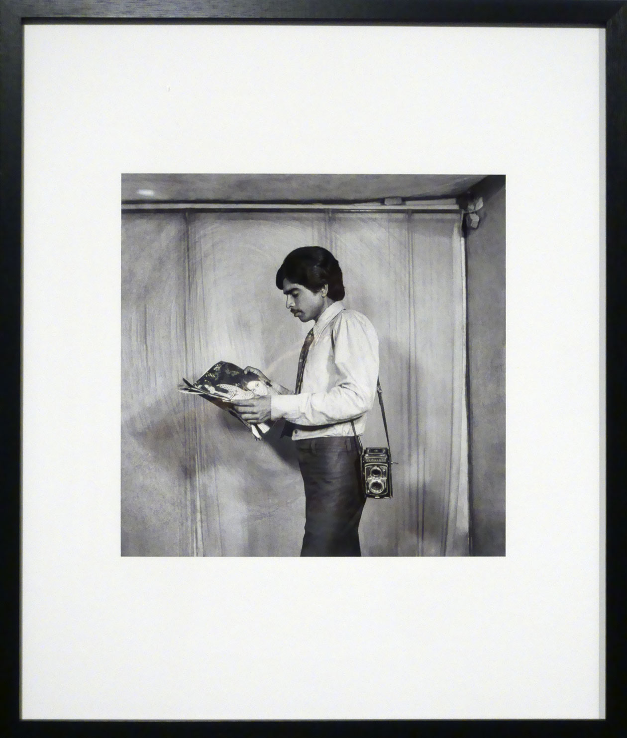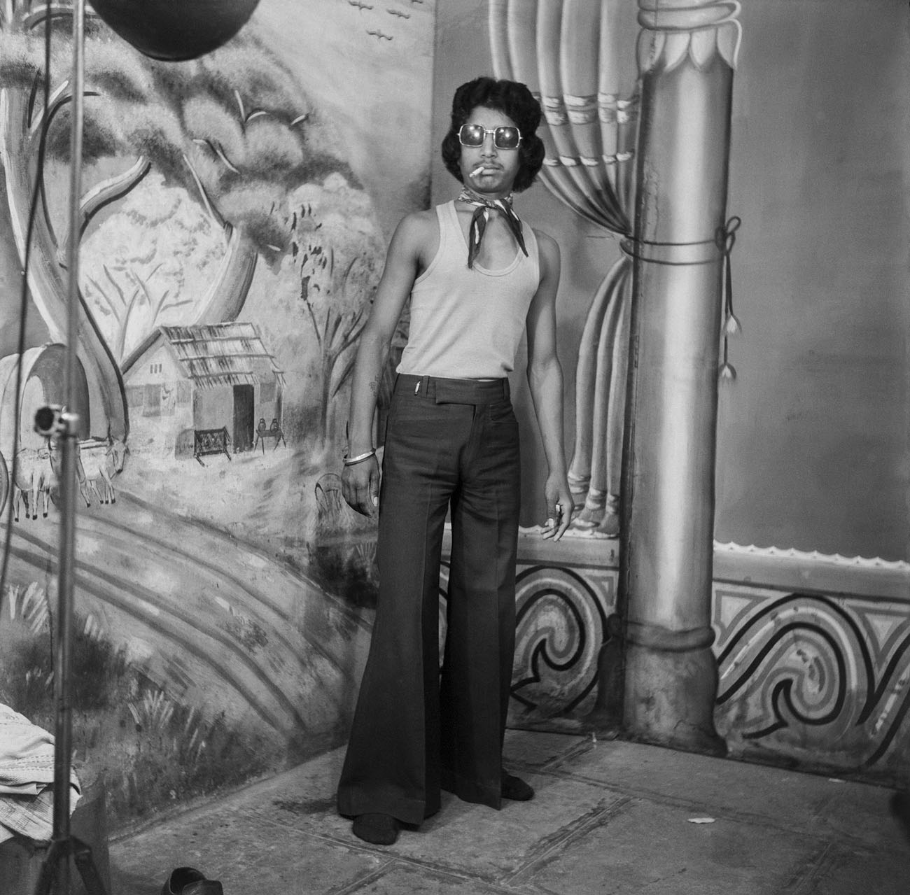 On first meeting the man photographed here, Punjabi remarked how much he resembled the actor Amitabh Bachchan. In this portrait, the man’s long legs – much like Bachchan’s – appear even longer in his flared pants. The man’s distant stare, and the peeking studio lights on either edge of the frame, add further credibility to the fiction that this man is perhaps a body double preparing himself for an actual film scene. Being one of the most recognisable of Punjabi’s individual portraits, this image also appears on the cover of scholar Christopher Pinney’s book Artisan Camera: Studio Photography from Central India (2013).
