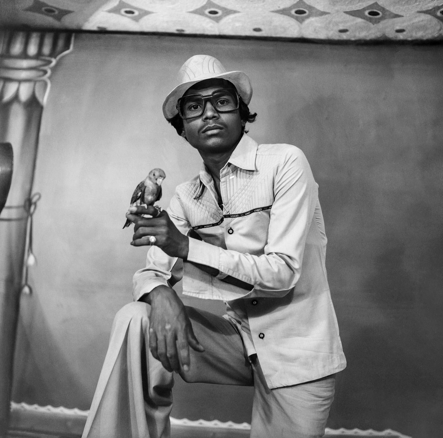 On entering Suhag Studio, the man in this portrait had one simple request for Punjabi: to be photographed with his beloved pet bird. In the resulting image, the man appears in flared trousers, thick-rimmed glasses and a rounded hat, leaning on a stool as his bird sits on his left index finger. In a bid to further accentuate the man’s lean, Punjabi tilts his camera to his right when taking the image, causing the painted background to appear slanted.