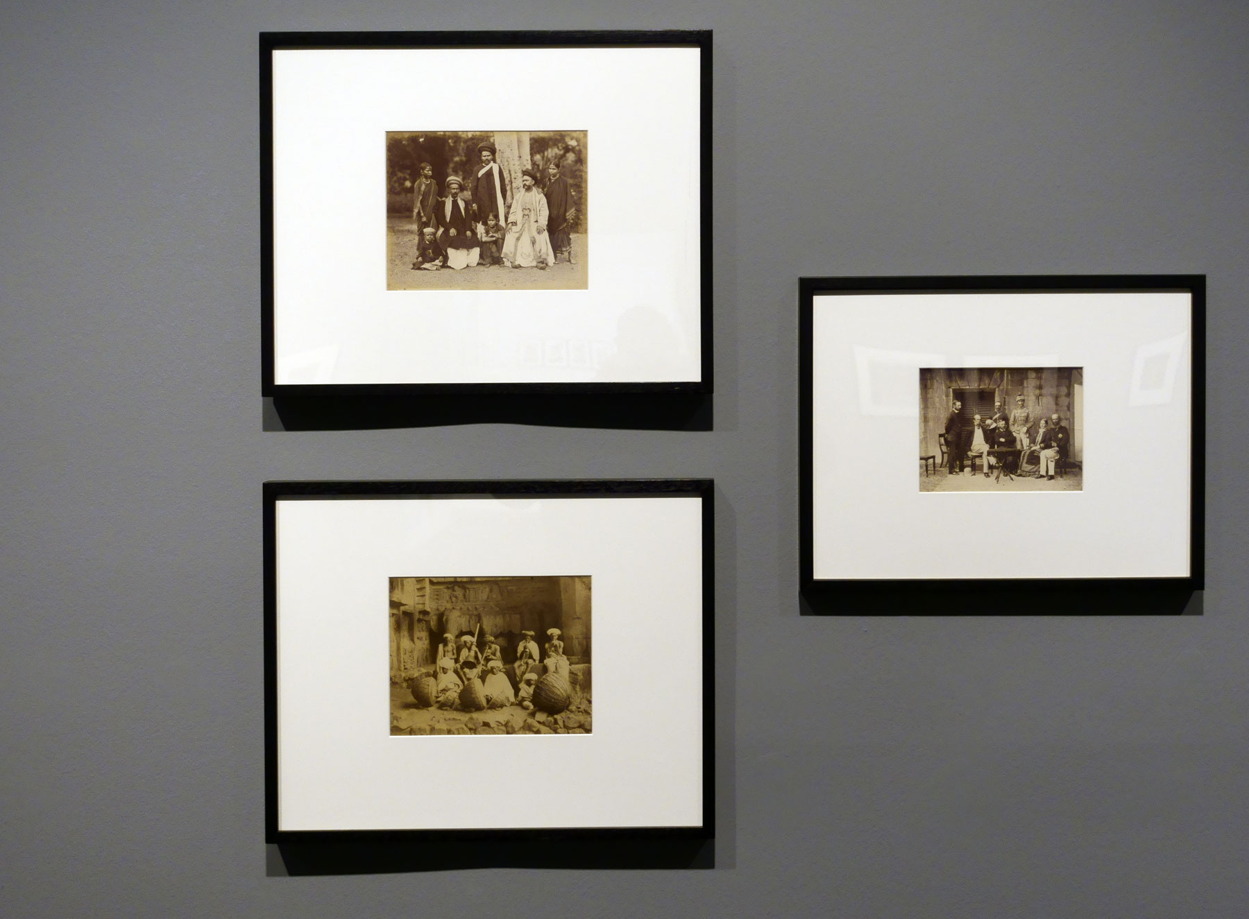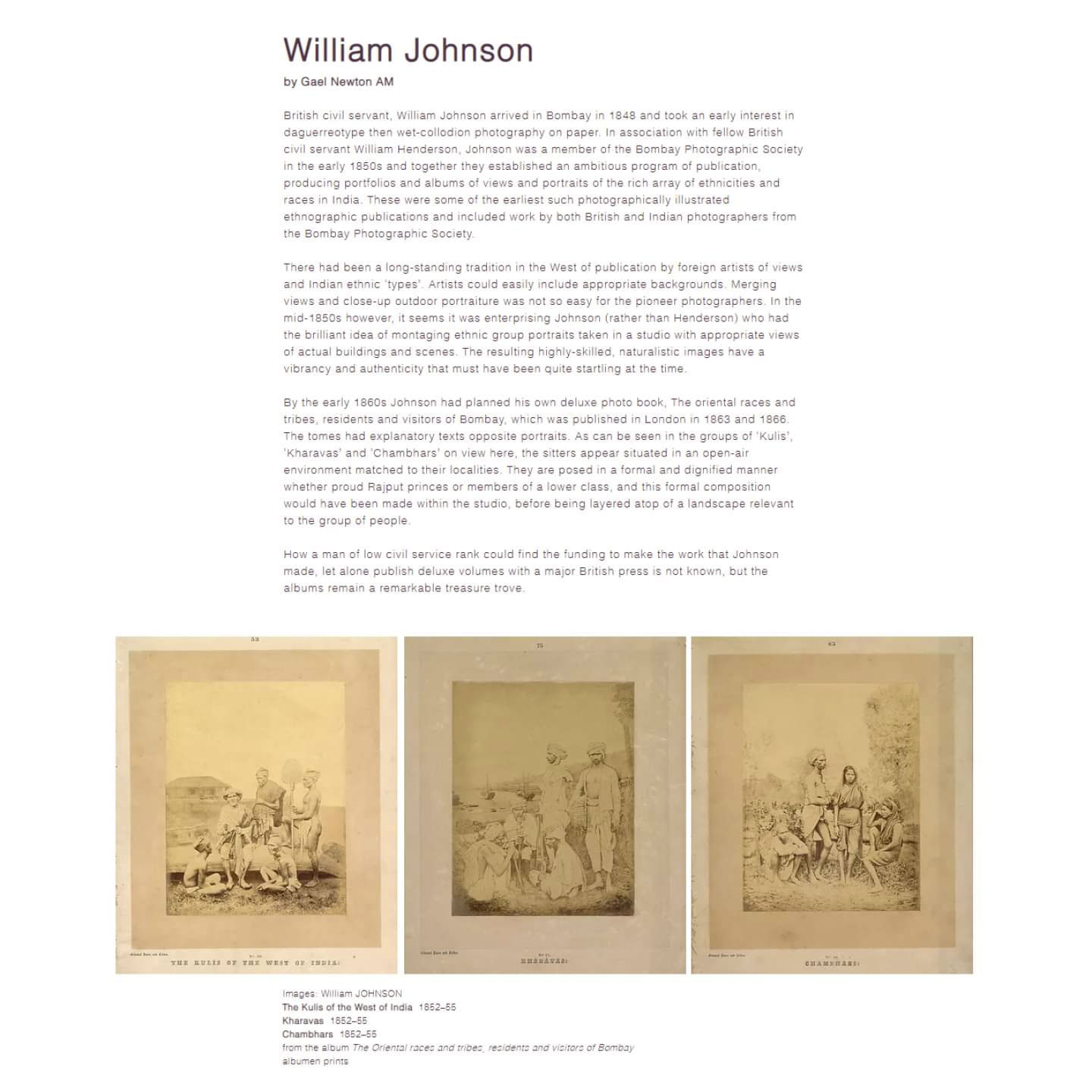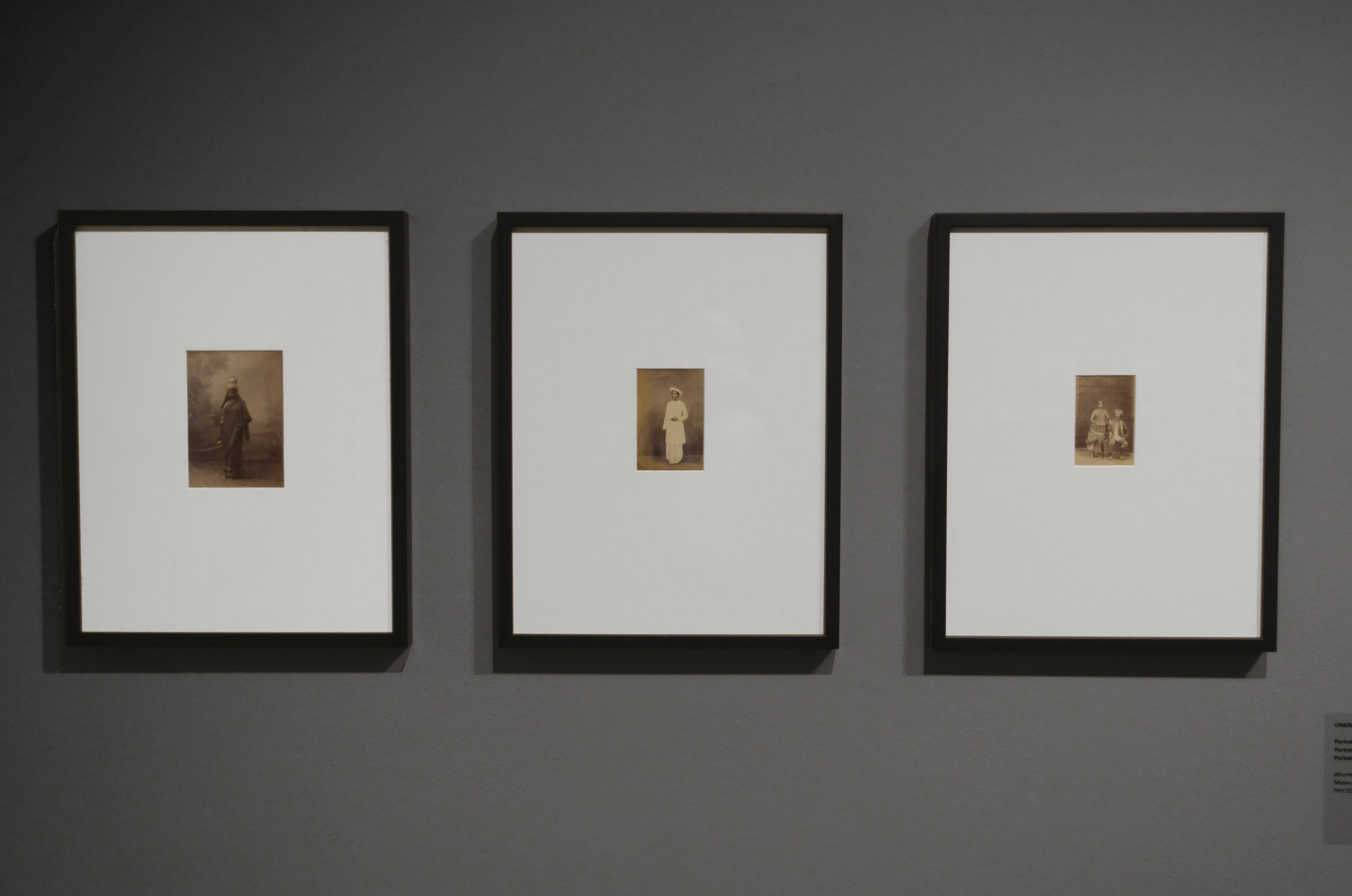 Installation view of the exhibition Visions of India: from the colonial to the contemporary at the Monash Gallery of Art showing the photographs of William Johnson (English, date born unknown – 1886) from the album The Oriental races and tribes, residents and visitors of Bombay with at left, The Kulis of the West of India (1852-1855, below); at centre, Chambhars (1852-1855, below); and at right, Kharavas (1852-1855, below)