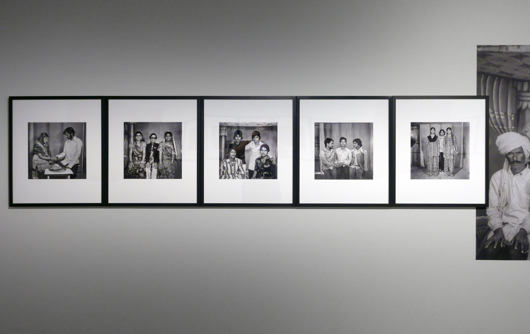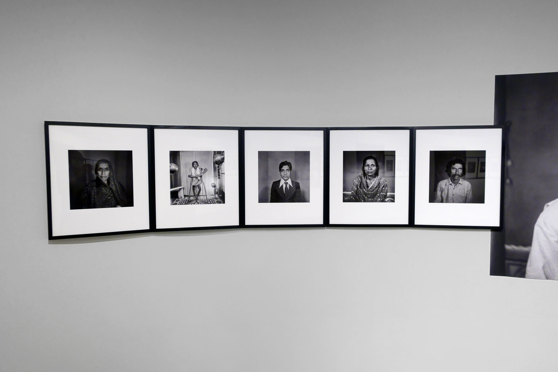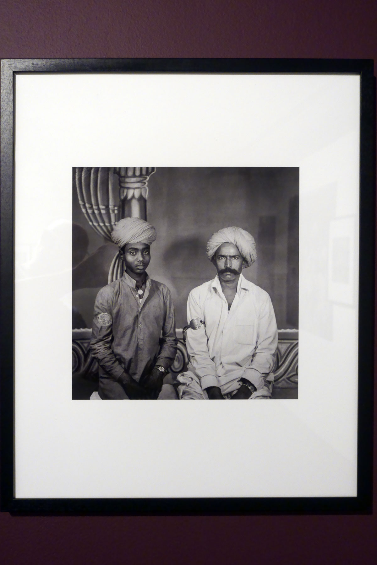 Installation view of the opening of the exhibition Visions of India: from the colonial to the contemporary at the Monash Gallery of Art showing at left, Suresh Punjabi’s Untitled (Two train porters, Behru Singh and his son Laxman) (Nd, below)
