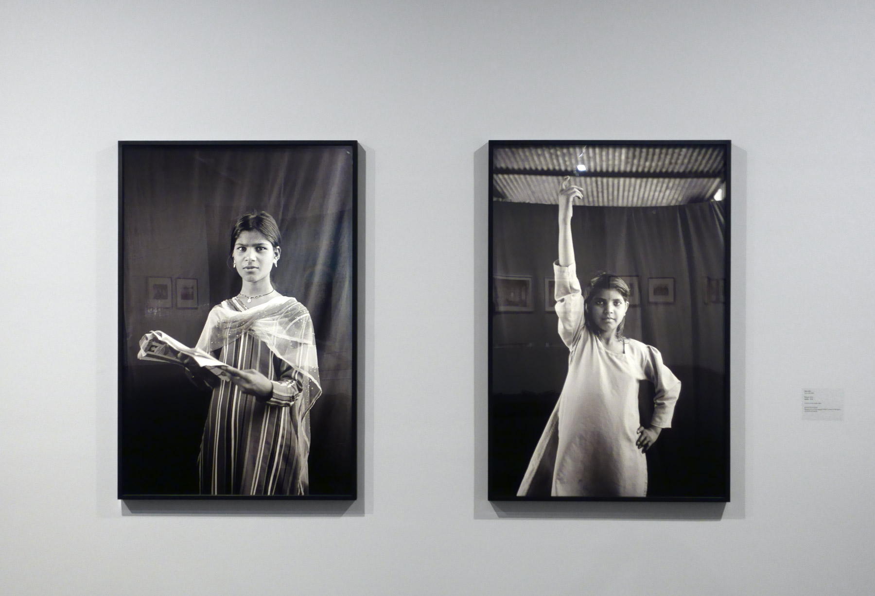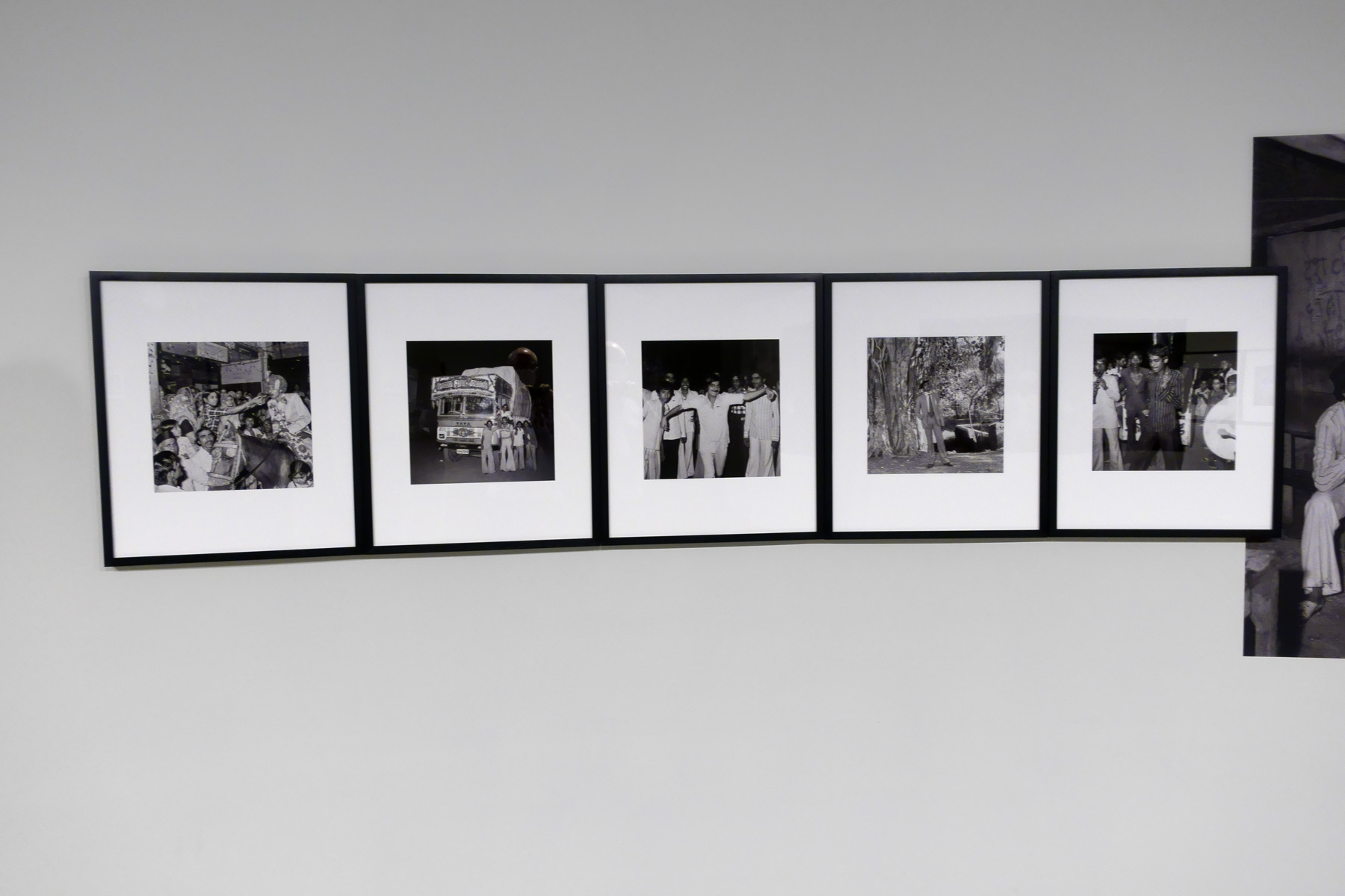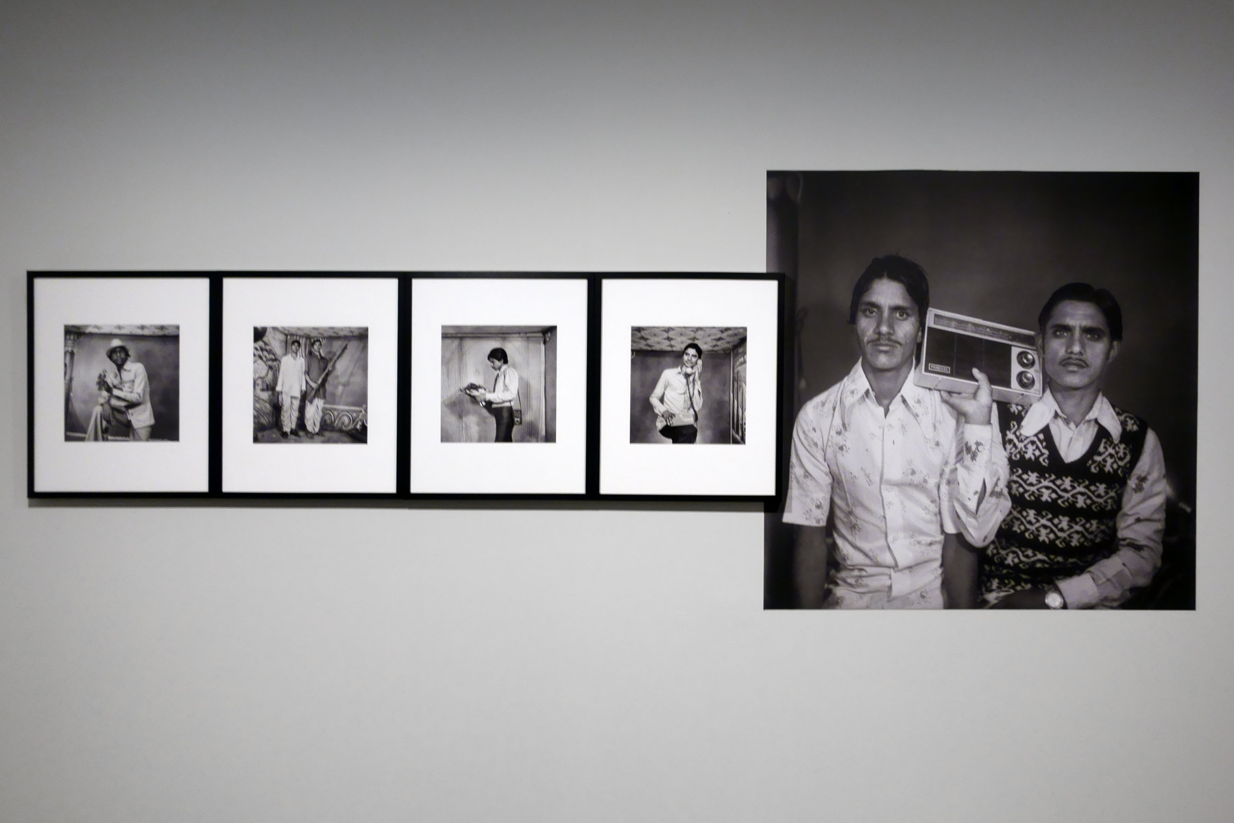Installation view of the opening of the exhibition Visions of India: from the colonial to the contemporary at the Monash Gallery of Art showing at left, Suresh Punjabi’s Untitled (Two train porters, Behru Singh and his son Laxman) (Nd, below)