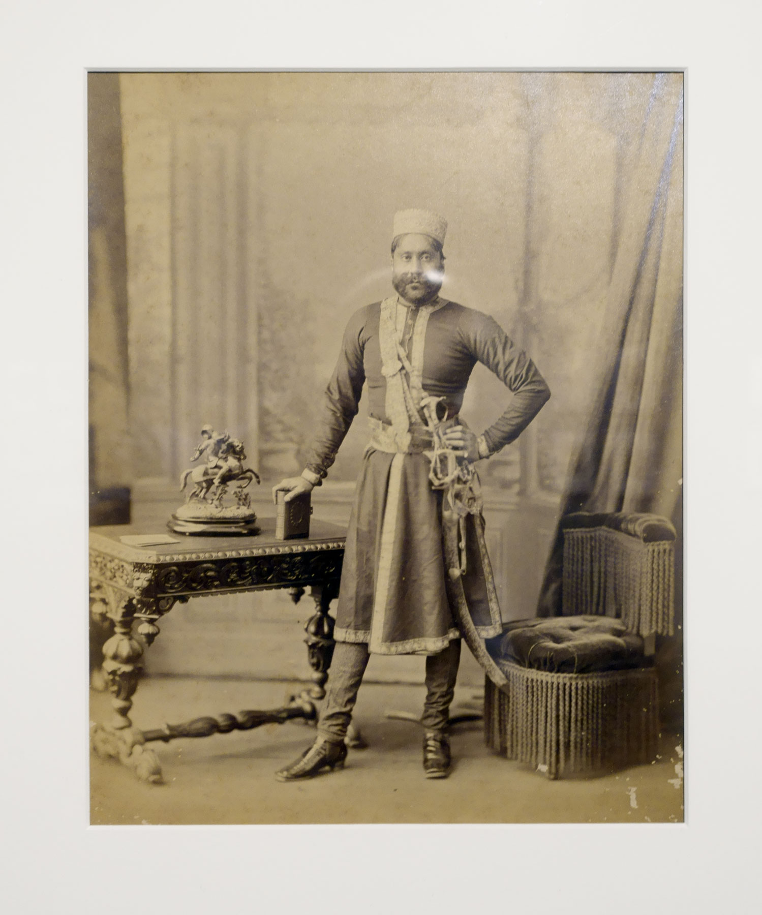 Installation view of the exhibition Visions of India: from the colonial to the contemporary at the Monash Gallery of Art showing at left, Johnston & Hoffmann’s Maharao Raja Sir Ramsinghji, Bahadur of Bondi (1887, below): and at right, four images by Layla Deen Dayal (c. 1880) from the album Princes and Chiefs of India