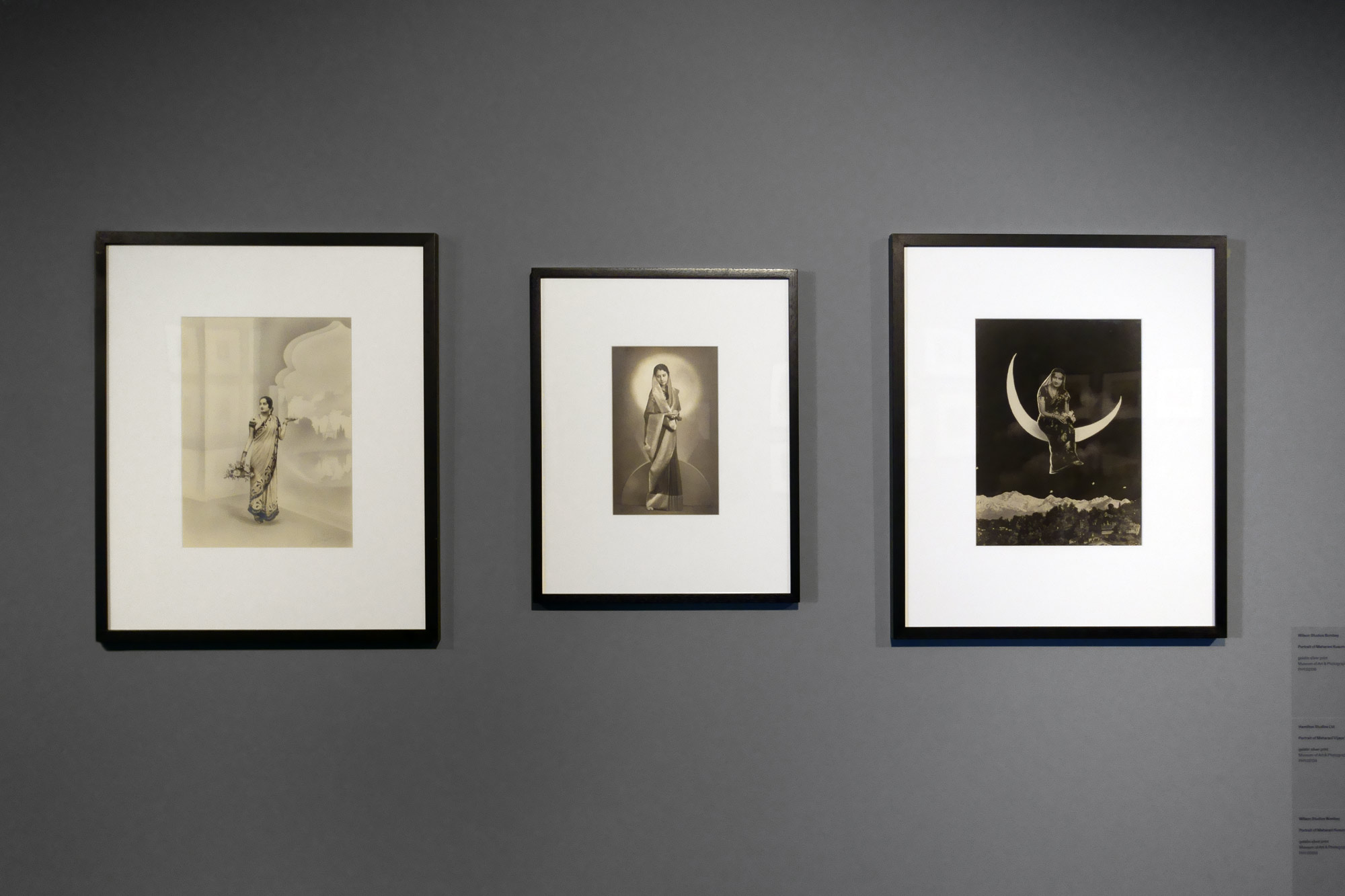 Installation views of the exhibition Visions of India: from the colonial to the contemporary at the Monash Gallery of Art showing in the bottom image at left and right, Wilson Brothers Bombay Portrait of Maharani Kusum Kunwarba (both c. 1930, below); and at centre Hamilton Studios Ltd Portrait of Maharani Vijaya Raje Scindia (c. 1940, below)