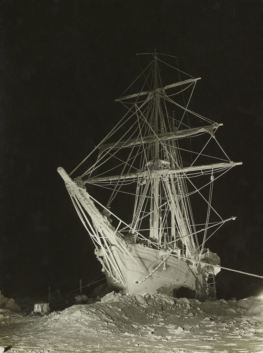 Photograph of the bow and part of the left side of Endurance, lit by flashlight in the darkness of the night. This is probably Hurley’s best-known photograph, which he took with flashlights at -38 °F/-39 °C. It was later used on the front cover of Shackleton’s account of the expedition, South. Hurley described the scene in his autobiography: Never did the ship look quite so beautiful as when the bright moonlight etched her in inky silhouette, or transformed her into a vessel from fairy-land.