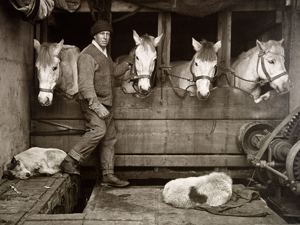 Continuing my fascination with all things Antarctic, here are more photographs from the Scott and Shackleton expeditions. The photograph Captain Lawrence Oates and Siberian ponies on board ‘Terra Nova’ by Herbert Ponting (1910, above) is simply breathtaking.