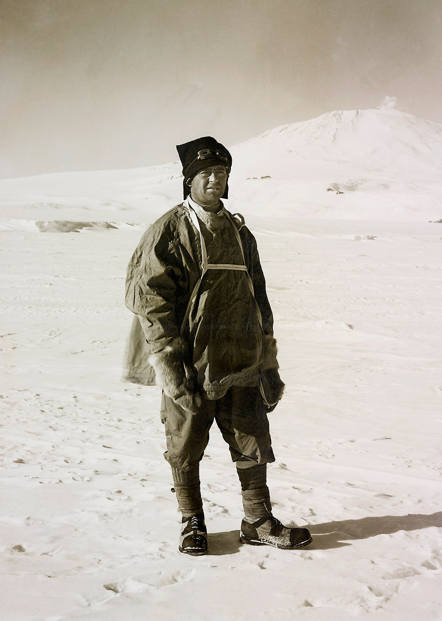 This photograph of Scott, with Mount Erebus in the background, was taken at the start of the expedition. He is wearing fur gloves with an attached cord, leather boots, gaiters and thick socks.