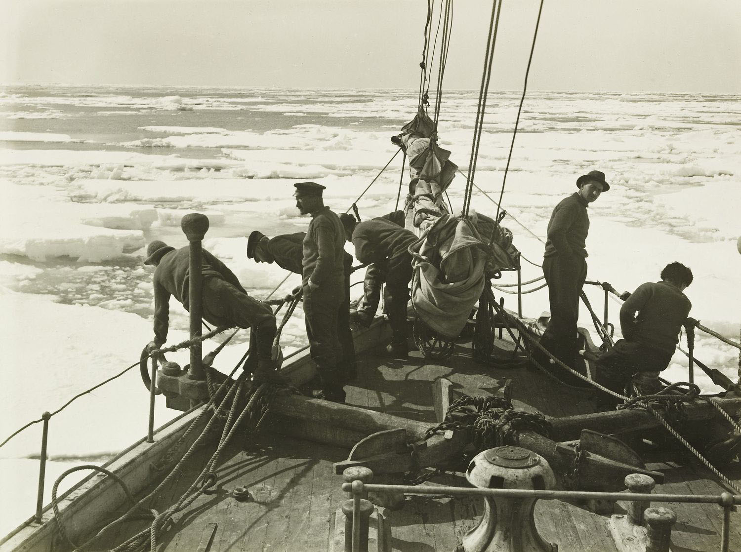 Photograph of six members of Shackleton’s crew standing on the deck of Endurance. This was the men’s first view of the pack ice through which they had to navigate in order to reach the coast of Antarctica. The Endurance met the ice far further north than they had hoped. The whalers on South Georgia had warned them of the poor ice conditions before they set out. This was a warning of things to come.