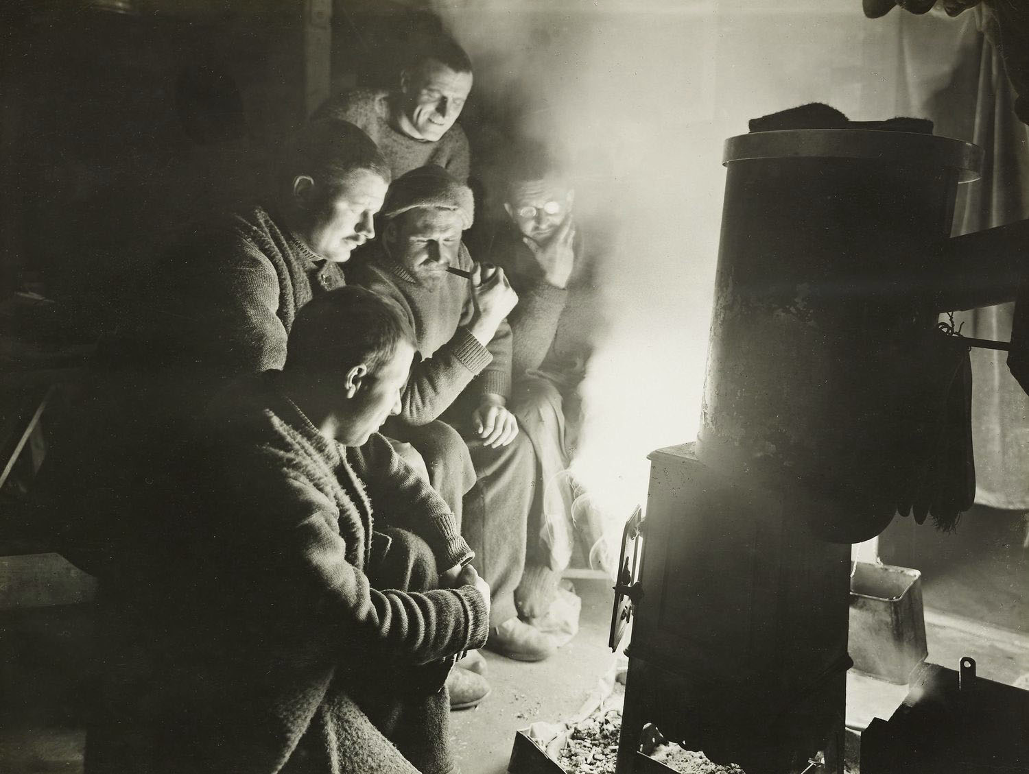 After Endurance became a winter station in February 1915, Shackleton abandoned the usual system of watches. The single nightwatchman had little to do, apart from tending the dogs and observing ice movements. It was private leisure time, to read, or do some washing, but often became a social occasion as shown here, as the men gather companionably round the fire.