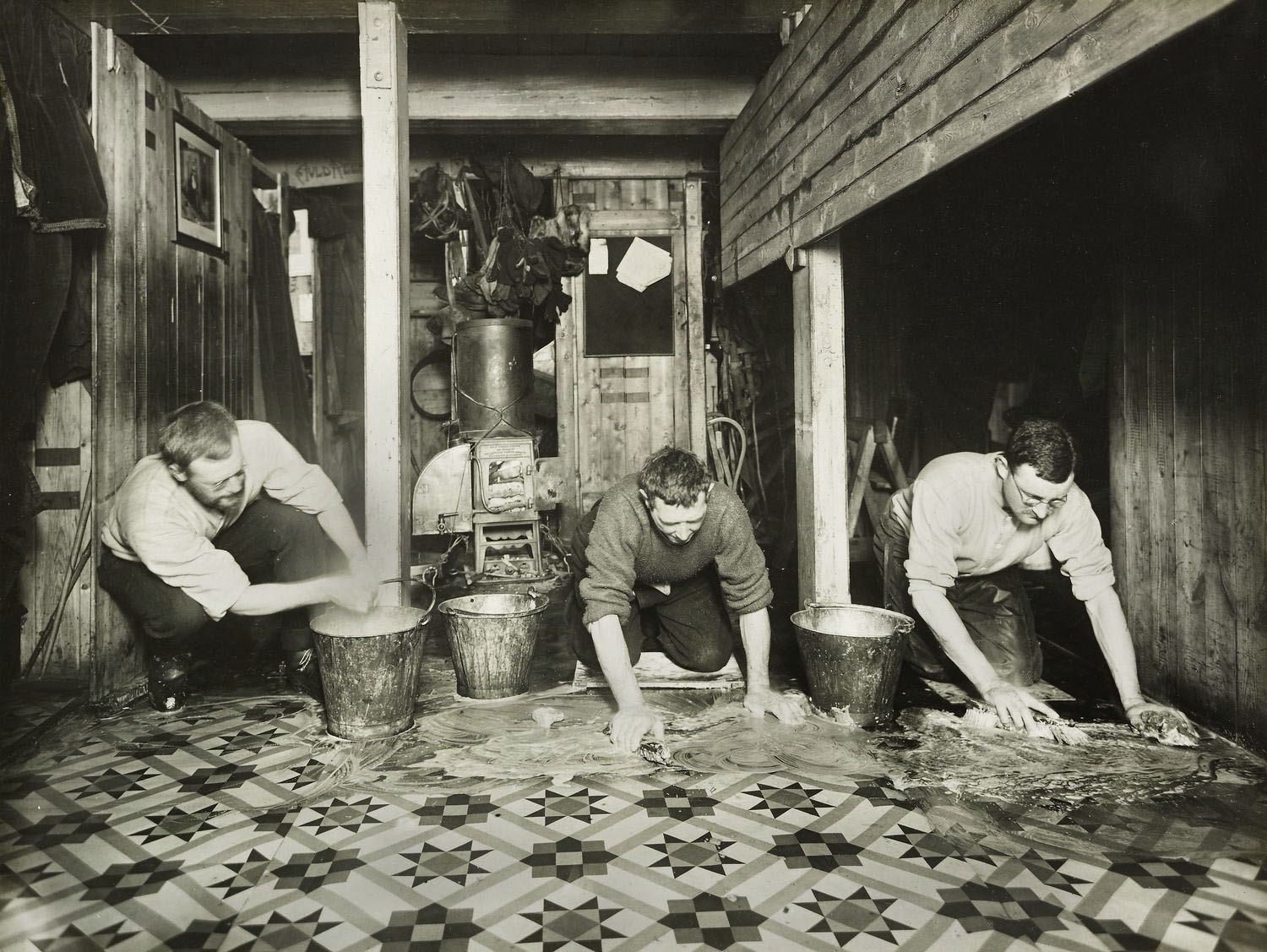 Following the onset of winter and the transformation of Endurance into a scientific station, the main cargo hold was emptied and turned into a communal living space for the men, nicknamed the ‘Ritz’. The traditional Antarctic Christmas on Midwinter’s Day (22 June) saw the ‘Ritz’ transformed for a cabaret, featuring satirical speeches, songs, poems and even a drag act. From left to right are Wordie (1889-1962), Cheetham (1867-1918) and Macklin (1889-1967).