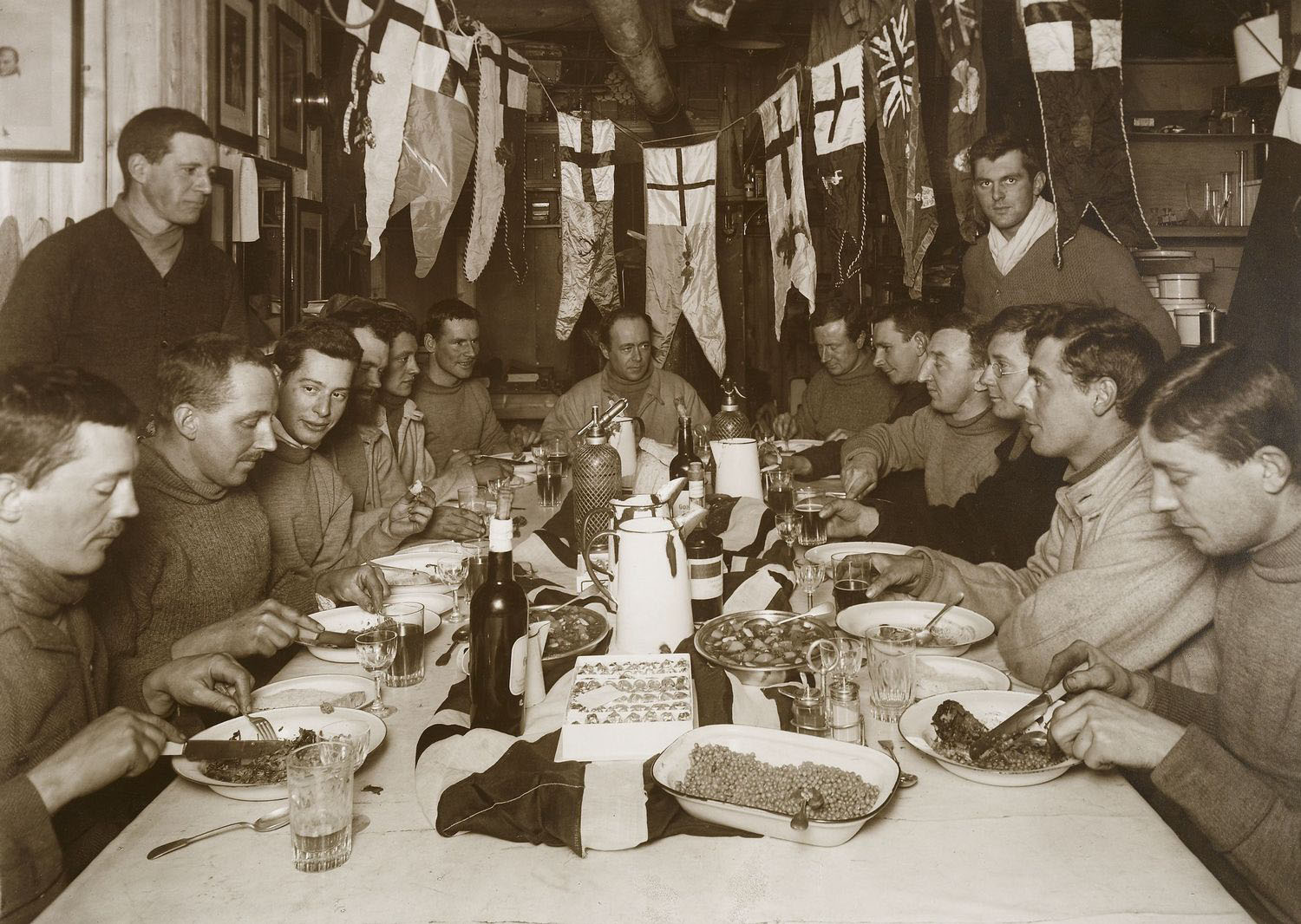 Photograph of the Officer’s table for Captain Scott’s birthday dinner with a variety of food and drink laid out on the table. The men are celebrating Scott’s 43rd birthday – his last – on 6 June 1911. He sits at the head of the table, and is surrounded by the officers and senior members of the team. The only man looking at the camera is the Norwegian naval officer Tryggve Gran (1889-1980). The atmosphere is both festive and patriotic.