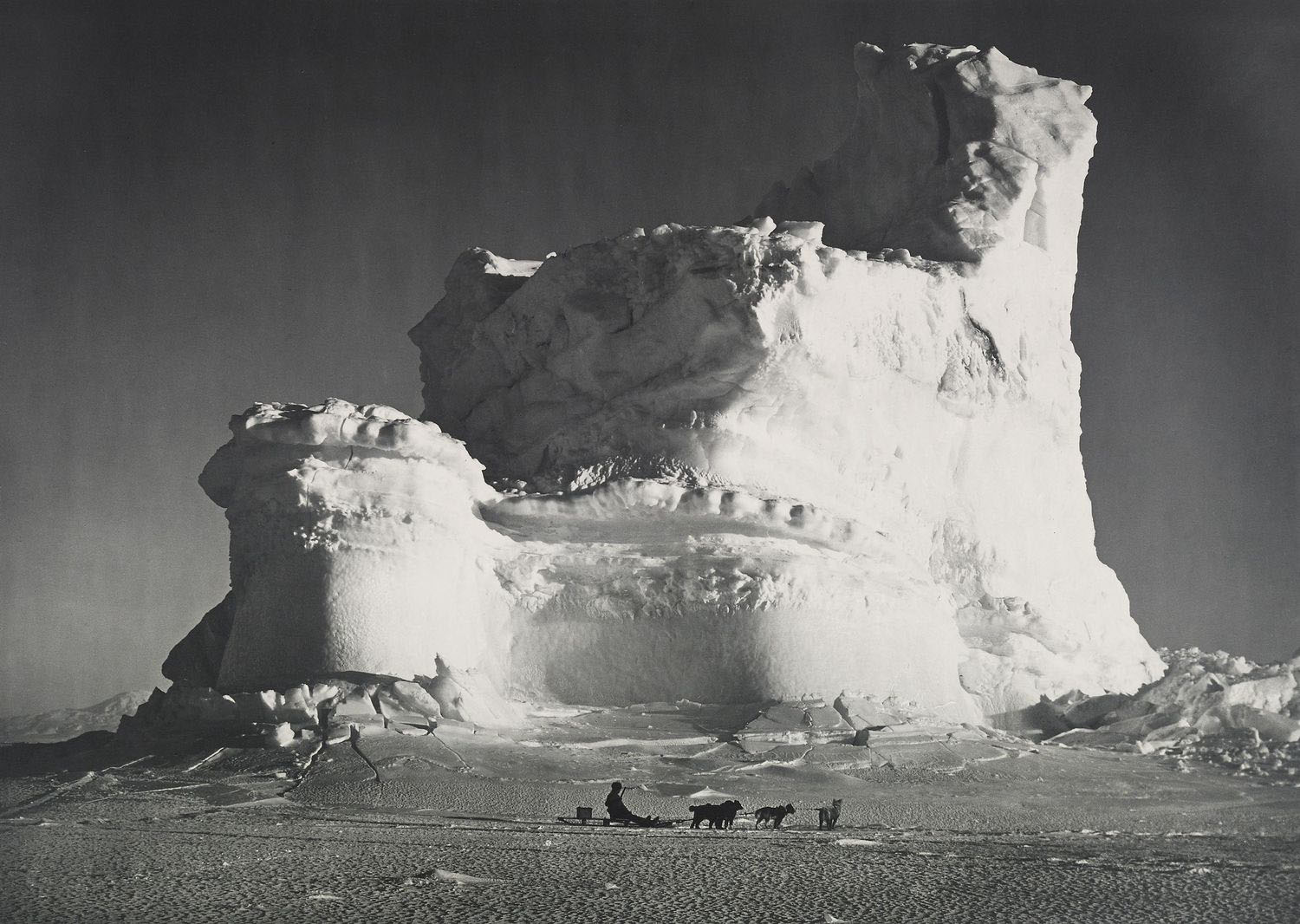 Mount Erebus, an active volcano on Ross Island which last erupted in 2008, was first climbed in 1908 by members of Shackleton’s Nimrod expedition. Ponting has contrasted the overwhelming size of the natural world against the tiny human figure pulling a sledge, in the lower left corner of the photograph.
