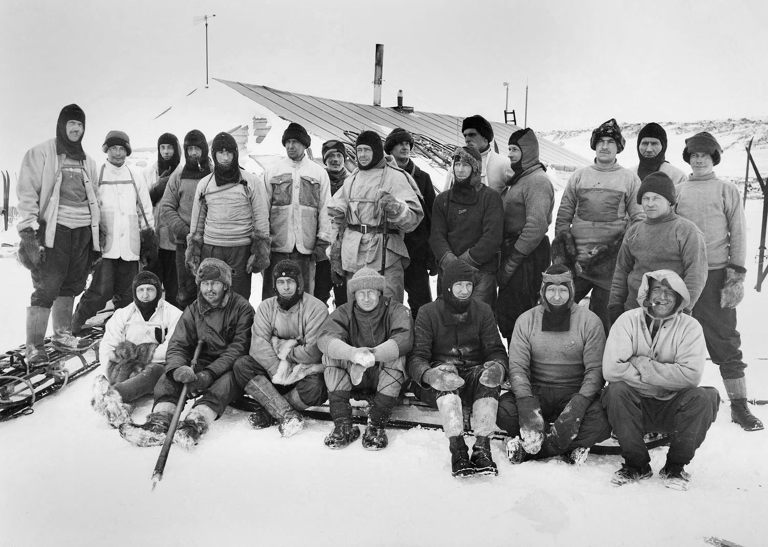 Photograph of the Shore party. On the back row are (from left to right): T. Griffith Taylor; Apsley Cherry-Garrard; Bernard Day; Edward Nelson; Edward Evans; Lawrence Oates; Edward Atkinson; Robert Falcon Scott; Charles Wright; Patrick Keohane; Tryggve Gran; William Lashly; Frederick Hooper; Robert Forde; Anton Omelchenko; Dimitri Gerov. On the front row are (from left to right): Henry Bowers; Cecil Meares; Frank Debenham; Edward Wilson; George Simpson; Edgar Evans and Tom Crean. This group is the Shore Party – the men who remained in Antarctica throughout the winter of 1911, preparing for Scott’s final departure for the Pole. They pose in front of the expedition hut at Cape Evans. The only people not visible are Clissold, the cook, and Ponting, the photographer. Scott is at the centre of the group and all the men look relaxed. This was taken at the very beginning of the expedition, when they would have been optimistic and excited about the future.