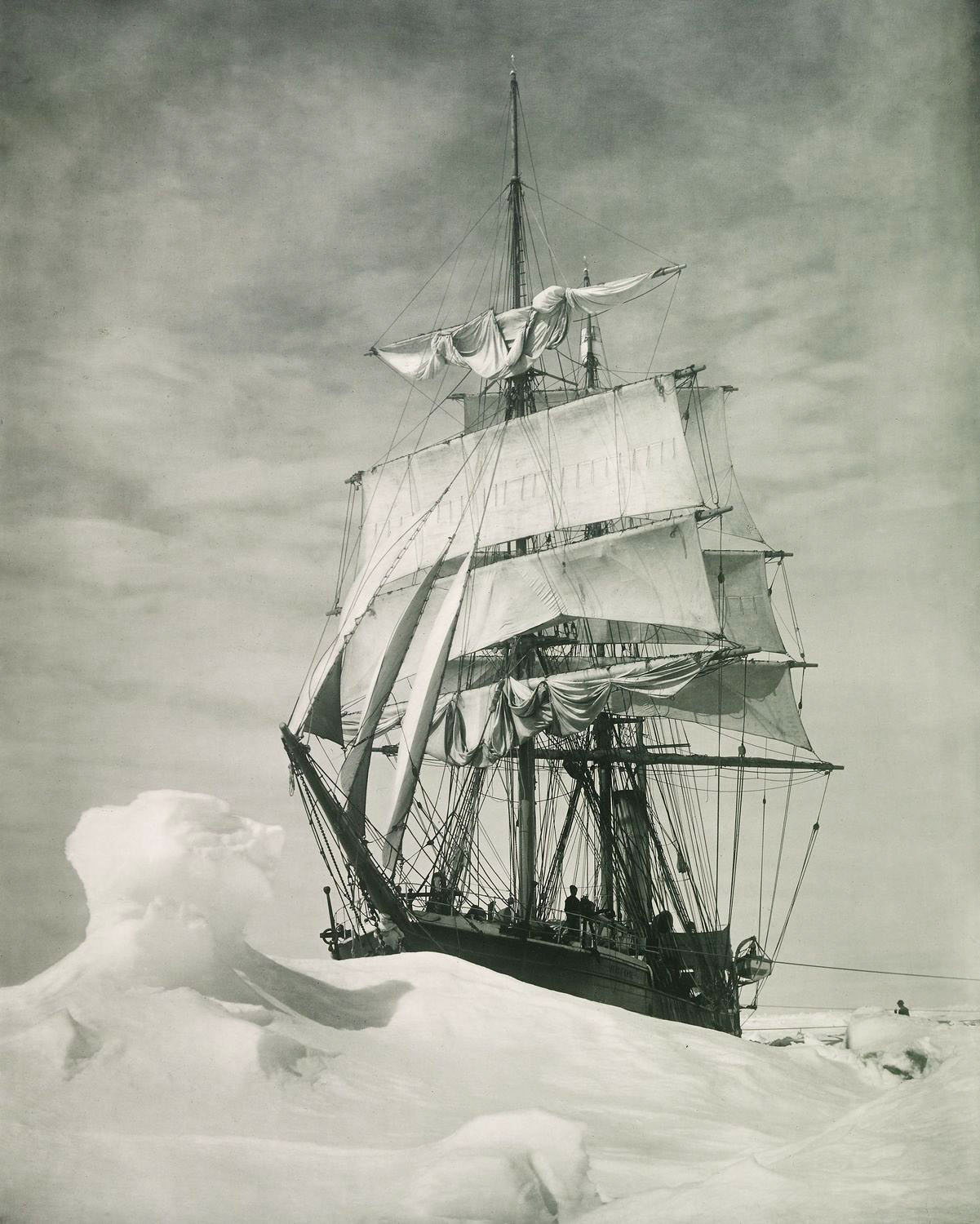 Photograph of the Terra Nova in sail, passing through ice and snow. Scott’s ship is seen here held up by the ice pack, with a curiously shaped ‘ice bollard’ in the foreground. The Terra Nova was launched in 1884 as a whaling ship. She had sailed to both the Arctic and Antarctic before serving as Scott’s ship in 1910. She survived until 1943 when she was damaged by ice and sank off the coast of Greenland.