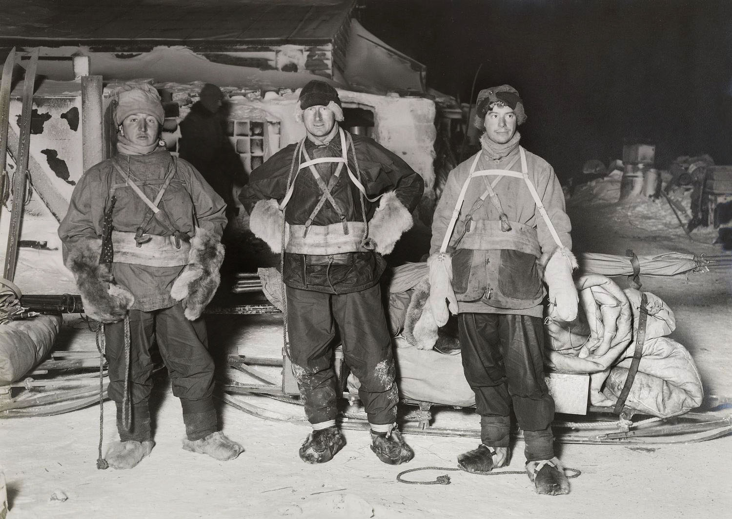 Henry Bowers (1883-1912), Edward Wilson (1872-1912) and Apsley Cherry-Garrard (1886-1959) are shown shortly before departing for Cape Crozier in search of Emperor penguin eggs. Between 27 June and 1 August, the trio endured extreme weather conditions and winter darkness as they crossed Ross Island and then returned, having collected three eggs. Cherry-Garrard famously described it as ‘the worst journey in the world’.