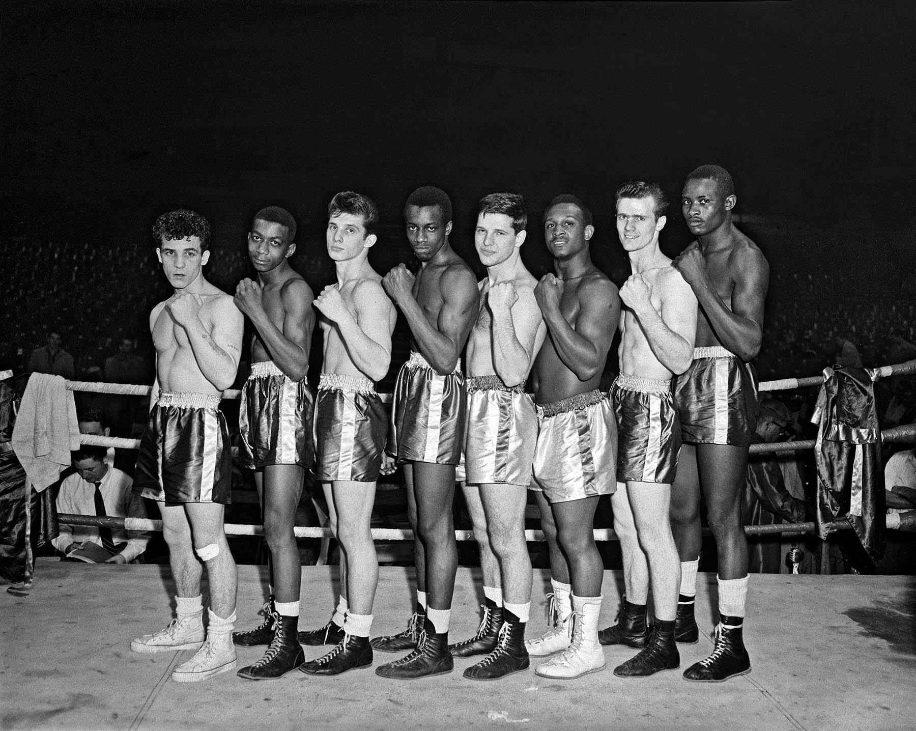 Boxers, possibly Golden Gloves contenders, possibly including Robert “Bobby” Matthews second from left, lined up in boxing ring