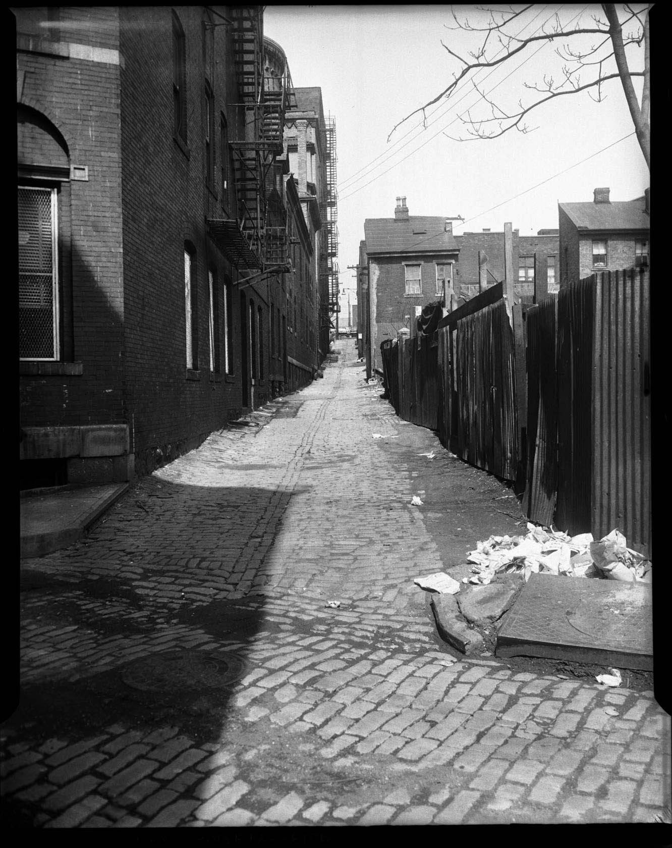 Earlier photographs of the city from the 1940s, such as Large two story home with attic, porch, double entryway, and yard, with young child on steps alone, next to smaller two story home with porches on both stories (c. 1940-45, below) have a touch of Walker Evans about them. Note how in this photograph the eve of the large two story home roof touches the top of the negative (allowing an exit for the eye at the top of the image), beautifully balanced on the left-hand side by the intrusion of the roof of another out of frame building and its shadow cast on the ground. The spatial separation between this roof and the porch of the smaller two story home is critical, as is the punctum of the child standing on the stoop. There are beautiful spaces in this photograph, as the eye plays across its surface, taking in form and detail, light and shade, eventually escaping down the right hand side of the building to the sky beyond.