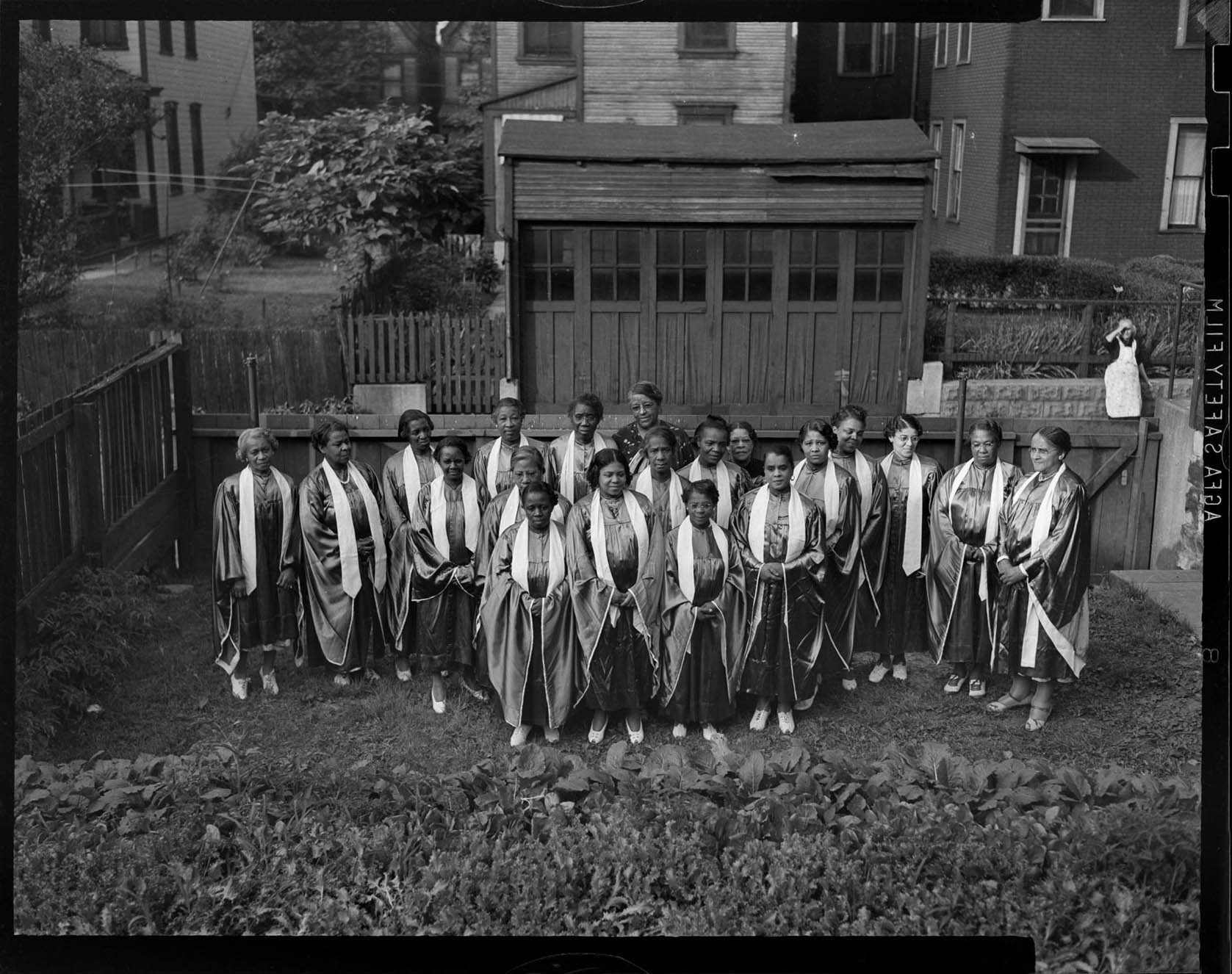Group portrait of women wearing church choir robes, posed outside in yard, with other houses, garage, and woman in background, seen from above