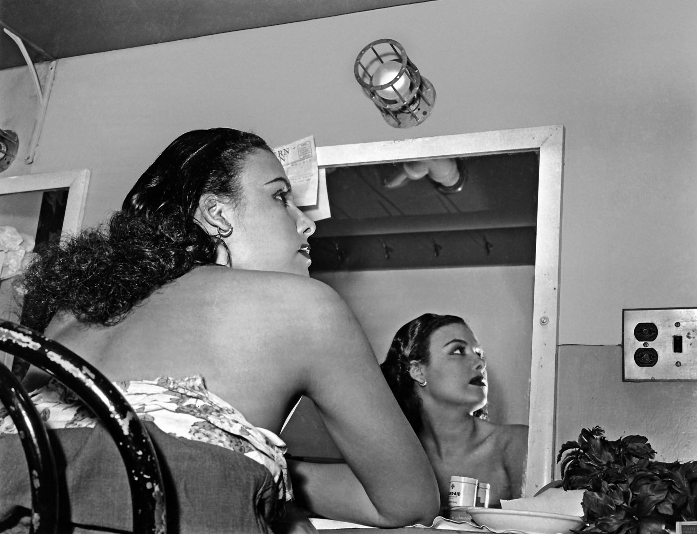 Lena Horne reflected in mirror in dressing room at Stanley Theatre