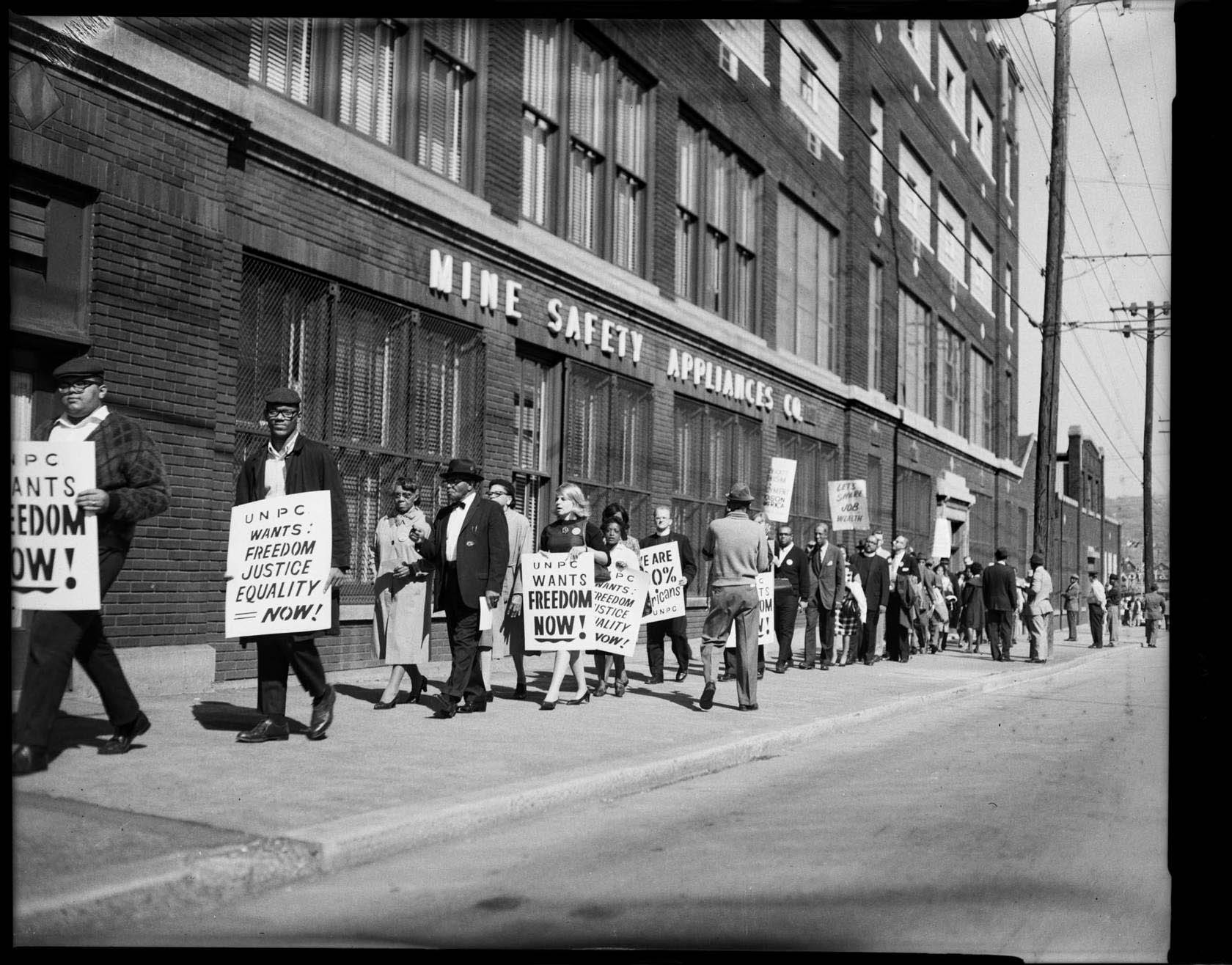 Protesters, including Ronald A. Crawley on left, with UNPC signs outside United Mine Safety Appliance Company, North Braddock Avenue and Meade Street, Homewood