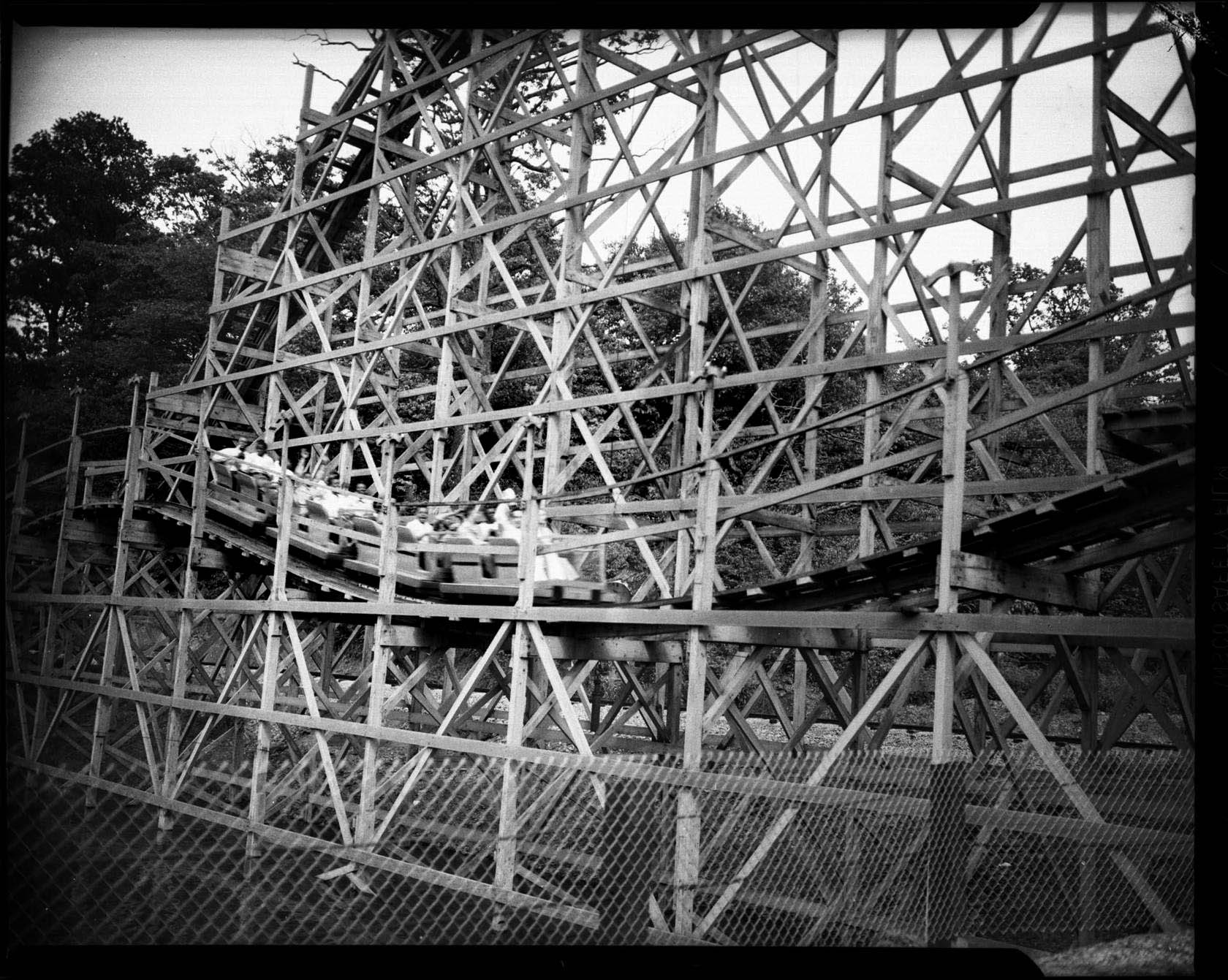 Wooden roller coaster, possibly at Rock Springs Park, Chester, West Virginia
