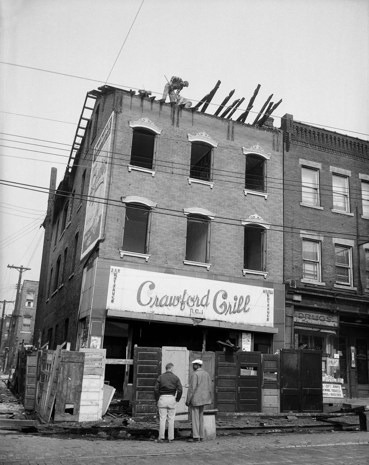 Workers demolishing roof of Crawford Grill No. 1, 1401 Wylie Avenue at Townsend Street, Hill District