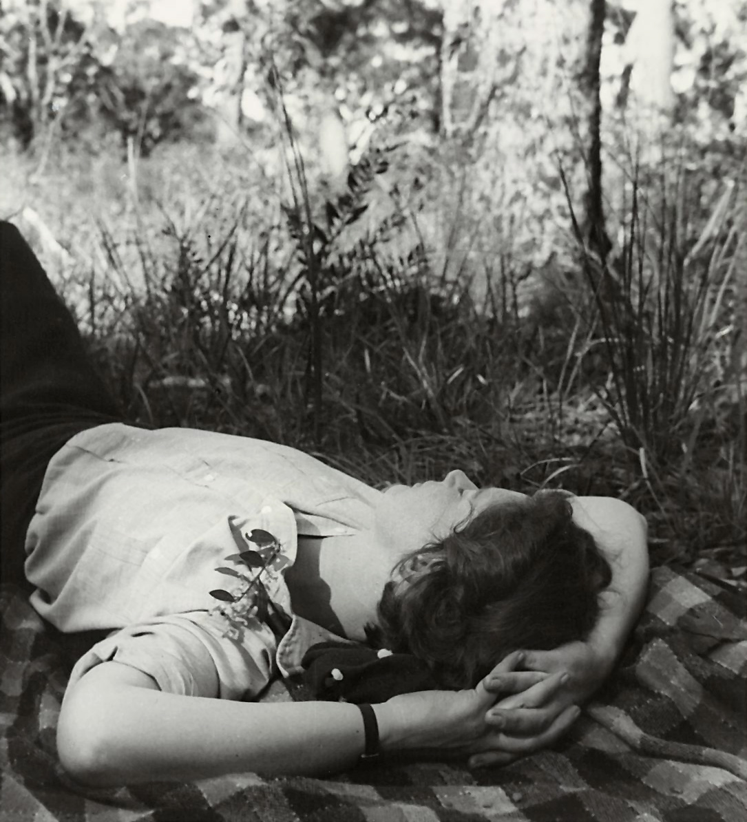 The sleeper 1939, Olive Cotton’s graceful study of her friend Olga Sharp resting while on a bush picnic, made around the same time as Max Dupain’s Sunbaker, presents a different take upon the enjoyment of life in Australia. The woman is relaxed, nestled within the environment. The mood is one of secluded reverie.