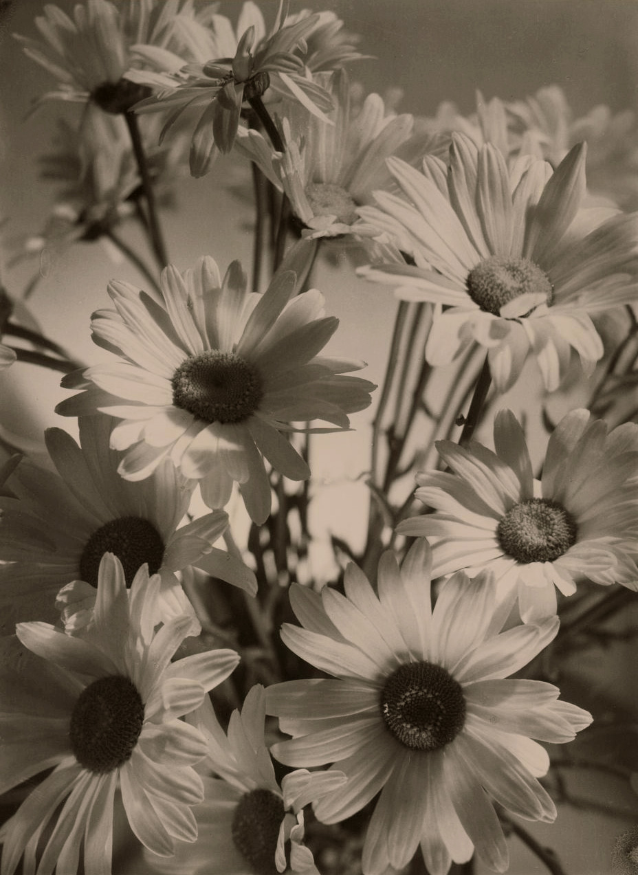 Shasta daisies is an interesting and rare combination of natural form and a highly-constructed scenario, the flowers having been photographed in Cotton’s studio and carefully arranged for the camera. Cotton, in the 1995 book, wrote of the photograph: “I chose to photograph these in the studio because out of doors I would have had less control of the lighting and background. I examined the composition very carefully through the studio camera’s large ground glass focussing screen and – the view from the camera’s position being slightly different to my own – made as many rearrangements to the flowers as seemed necessary. I then used (apart from a background light) one source of light to try and convey a feeling of outdoors.” Shasta daisies is important within Cotton’s oeuvre for uniting her interest in plants in their natural ‘outdoors’ environment with her enquiry into photographic form and space.