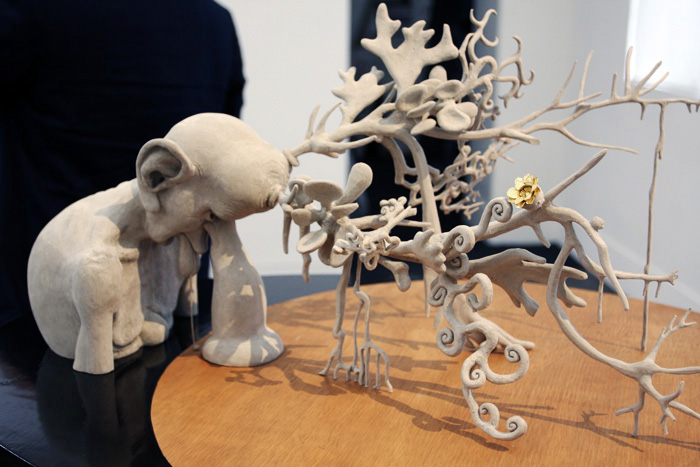 These two sculptures are fantastic: the first forming a skull made out of birds perched on a cross surmounted by a bird holding an olive branch, the title deliciously ironic; the second a stooped gargoyle like creature with a massive extrusion for a nose, hanging tongue dripping saliva and phantasmagorical protrusions emerging from it’s head making it impossible for the creature to ‘read well’ in both the metaphorical and literal sense. This is a beautiful but grotesque primordial fantasy with the horns putting roots down in the soil like the roots of a mangrove tree, a gold leaf flower blooming at their outer reaches, the creature exhausted by the effort of trying to keep his head up.