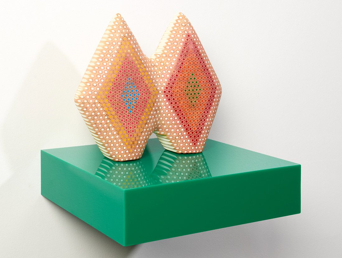 Here, two seemingly opposing containers of time – the body and the universe – are depicted as insulated, yet reflexive, systems. Just as skin imperfections are reminders of age, trauma, exposure and adaptation, the individual rocks at Wurdi Youang are conscious notations of the sun’s movements in the sky. Each rock or blemish represents a passed event that, in conjunction, forms the schema for a cosmos. Although more commonly understood as the extraterrestrial zone outside the Earth’s atmosphere (and therefore, outside of ourselves), the etymology of ‘cosmos’ is derived from the less-boastful ‘ornament’: a sphere seen as ultimately expansive is reined into a handheld trinket. This oscillation becomes an underlying consideration in Evans’ new work, as temporality swings between what is known, even embodied, and what is all encompassing.