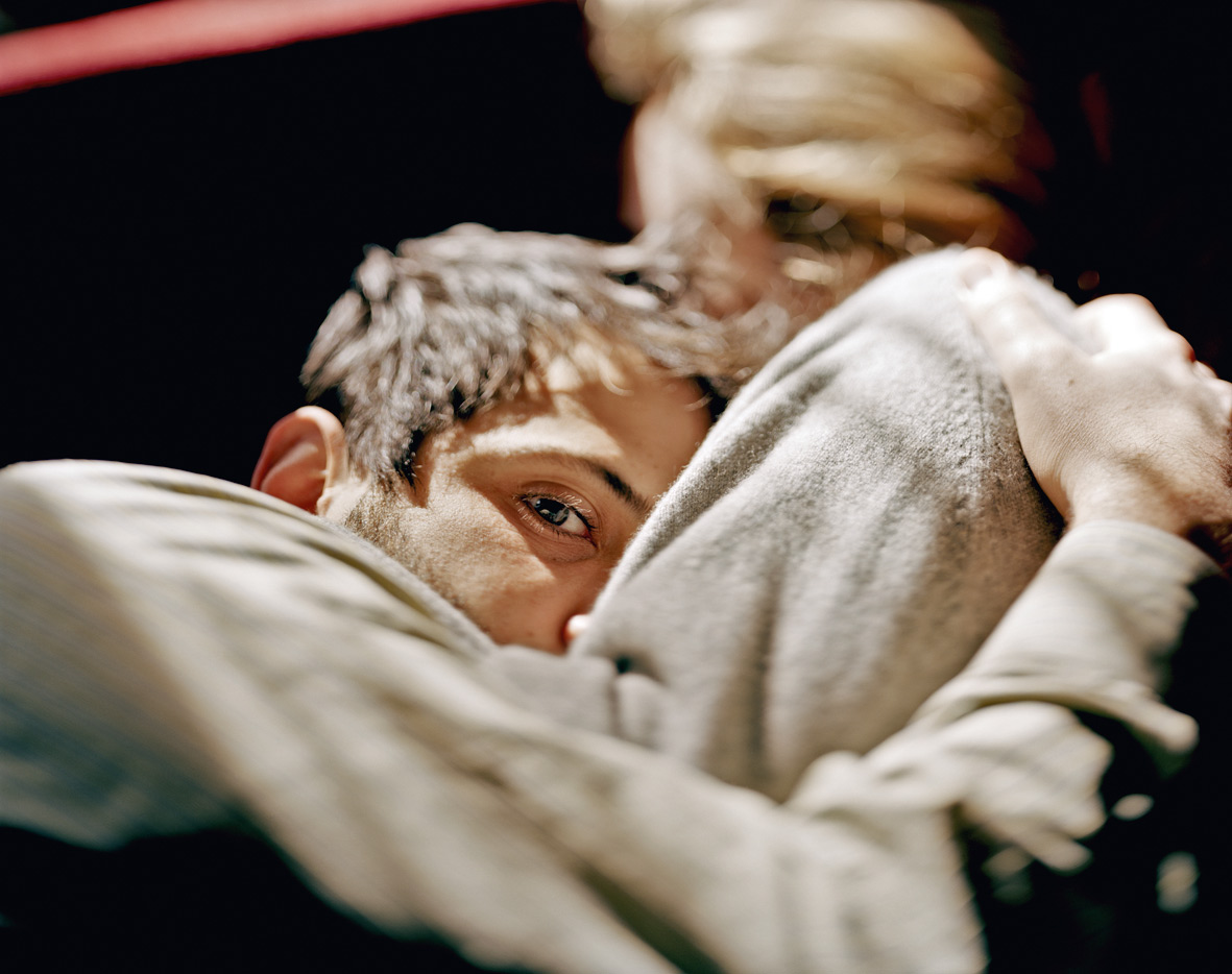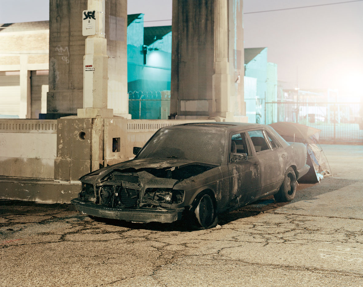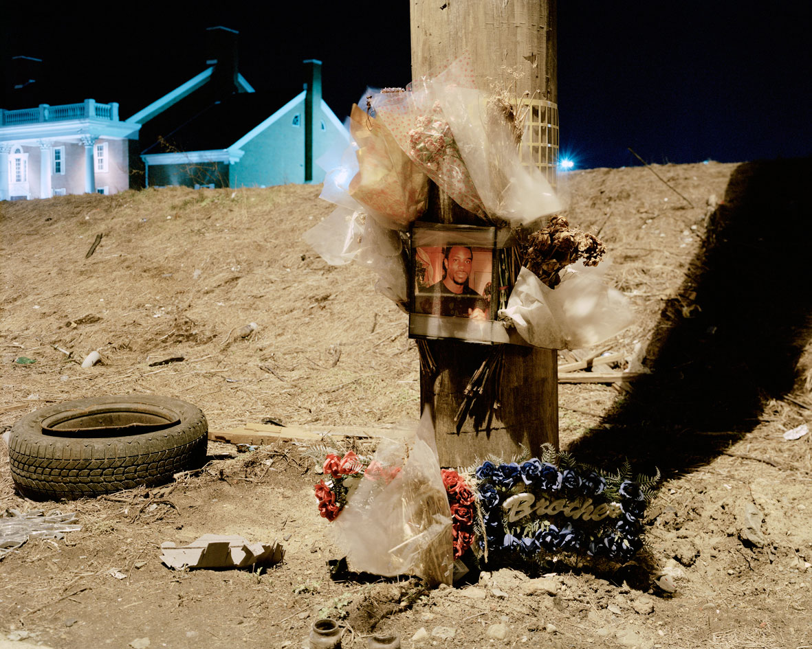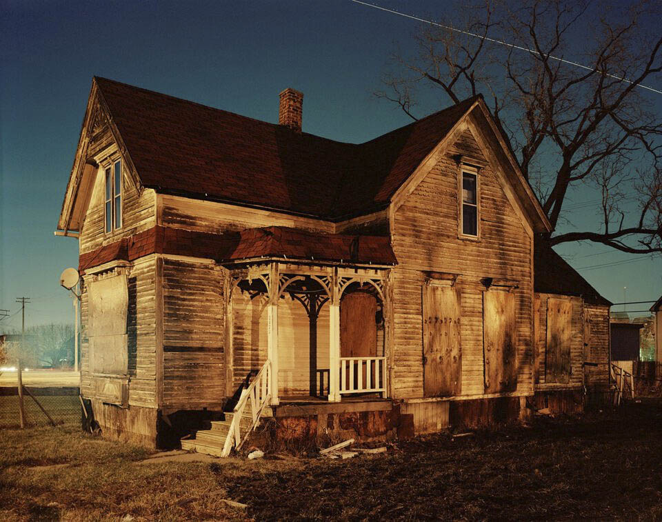 Gregory Crewdson describes his highly scripted photographs as single-frame movies; to produce them, he engages teams of riggers, grips, lighting specialists, and actors. The story lines in most of his photographs centre on suburban anxiety, disorientation, fear, loss, and longing, but the final meaning almost always remains elusive, the narrative unfinished. In this photograph something terrible has happened, is happening, and will likely happen again. A woman in a nightgown sits in crisis on the edge of her bed with the remains of a rosebush on the sheets beside her. The journey from the garden was not an easy one, as evidenced by the trail of petals, thorns, and dirt. Even so, the protagonist cradles the plant’s roots with tender regard.