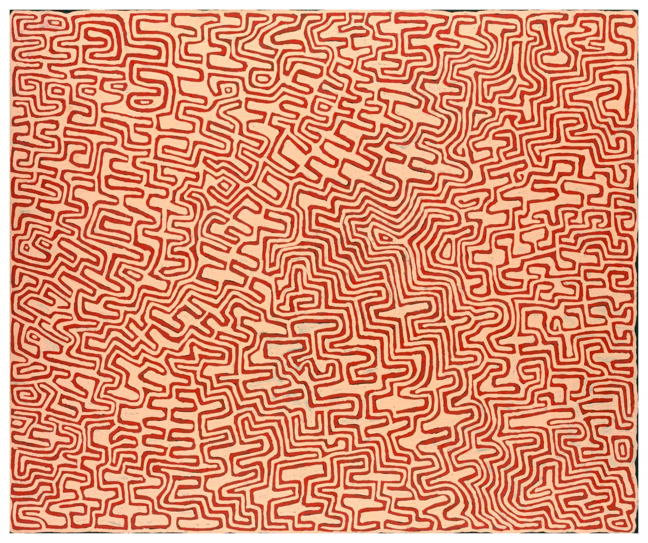 During the first decade of the 21st century, Pintupi, Spinifex, Anangu, Yulparija and Martu artists have developed a dynamic and fresh expression of Western Desert Art. The male and female artists not only share close kinship, social, linguistic and ritual interconnections and lived experience of desert country built up during pujiman (nomadic, bush) days but also have parallel experiences of making art with introduced materials for the commercial market. Their paintings – bearers of sanctity – resonate with the shock of the ancient made new and tell tjukurrpa (stories) associated with special places in their ngurra (country).This dramatic new wave of acrylic painting is the focus of Living Water, comprising the NGV’s 150th anniversary gift from the Felton Bequest of 107 paintings.
