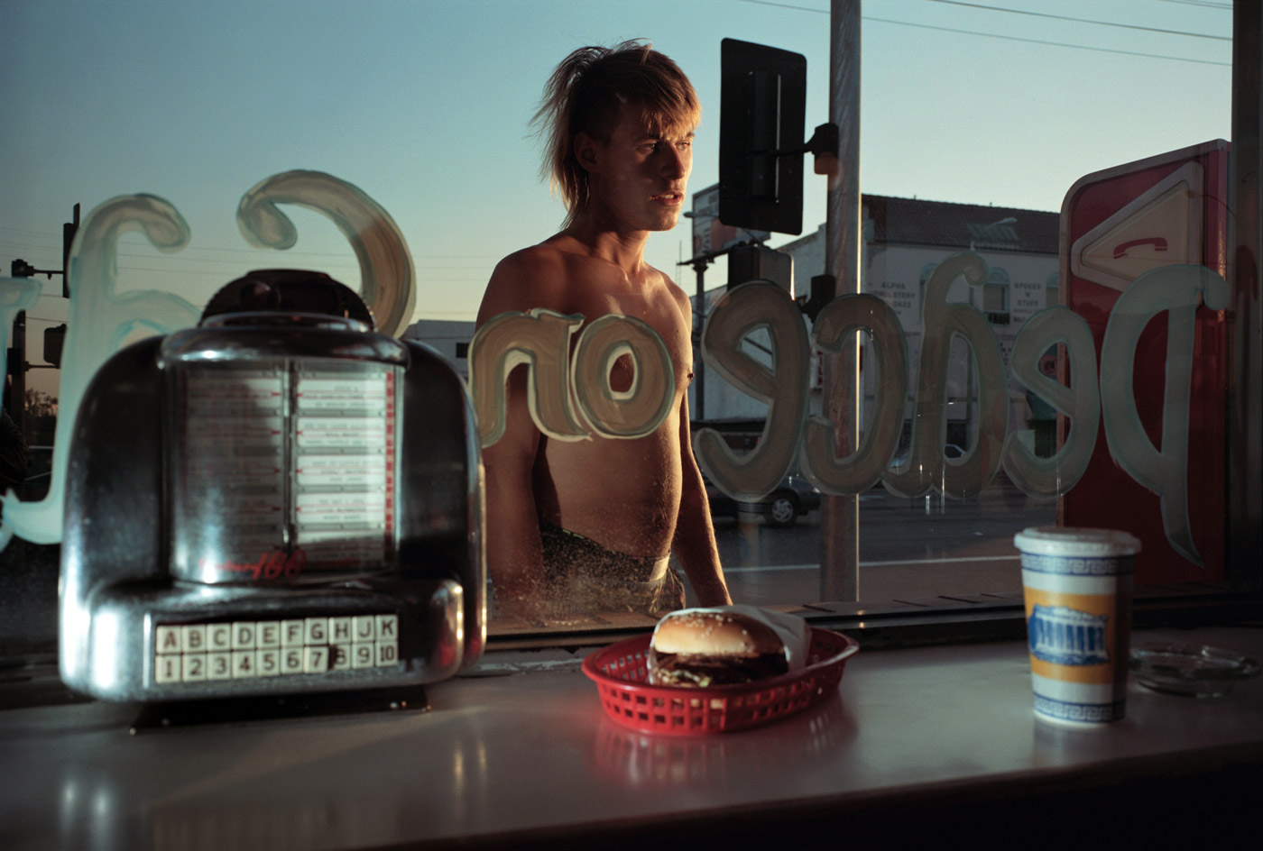 The stillness and silence of the photographs subjects let the viewer examine the details of the mise en scène… the perfectly placed Coke bottle and apple, the shredded American flag in Palm Springs, The Kite (2018); the bandaged knee, the dripping ice cream in Rain, The Ice Cream Parlour (2004); and also admire the beautiful textures and lighting of the finished “product”, for Olaf’s aesthetic riffs on subverting theatrical performances and magazine fashion shoots.