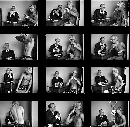 In Michals work, the immediate and the infinite spar. In the show is a single image by a little-known photographer named John F. Collins. The 1935 self-portrait shows Collins looking at us while holding a large photograph of himself; in that photograph he is looking down at the same photograph of himself. In each subsequent picture within a picture, he is looking out, and then into the photograph he is holding, into a spiralling infinity.