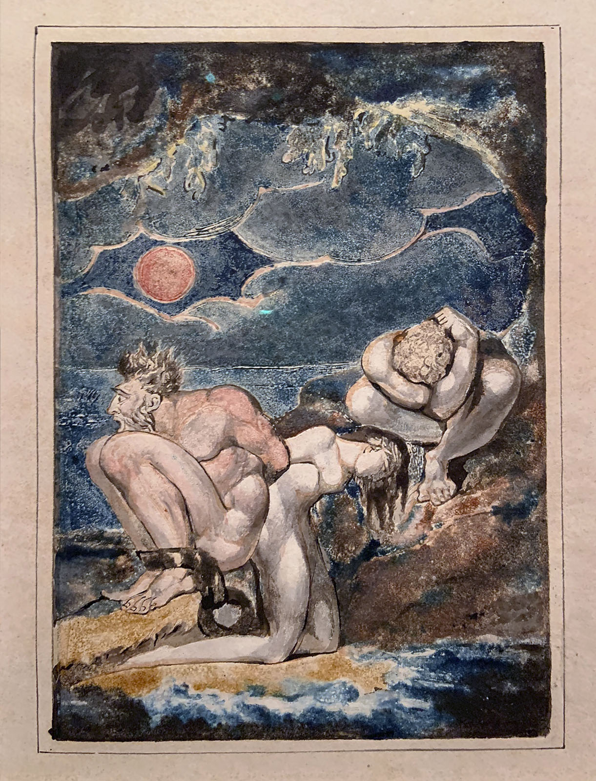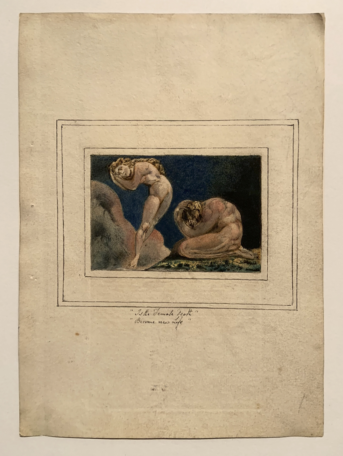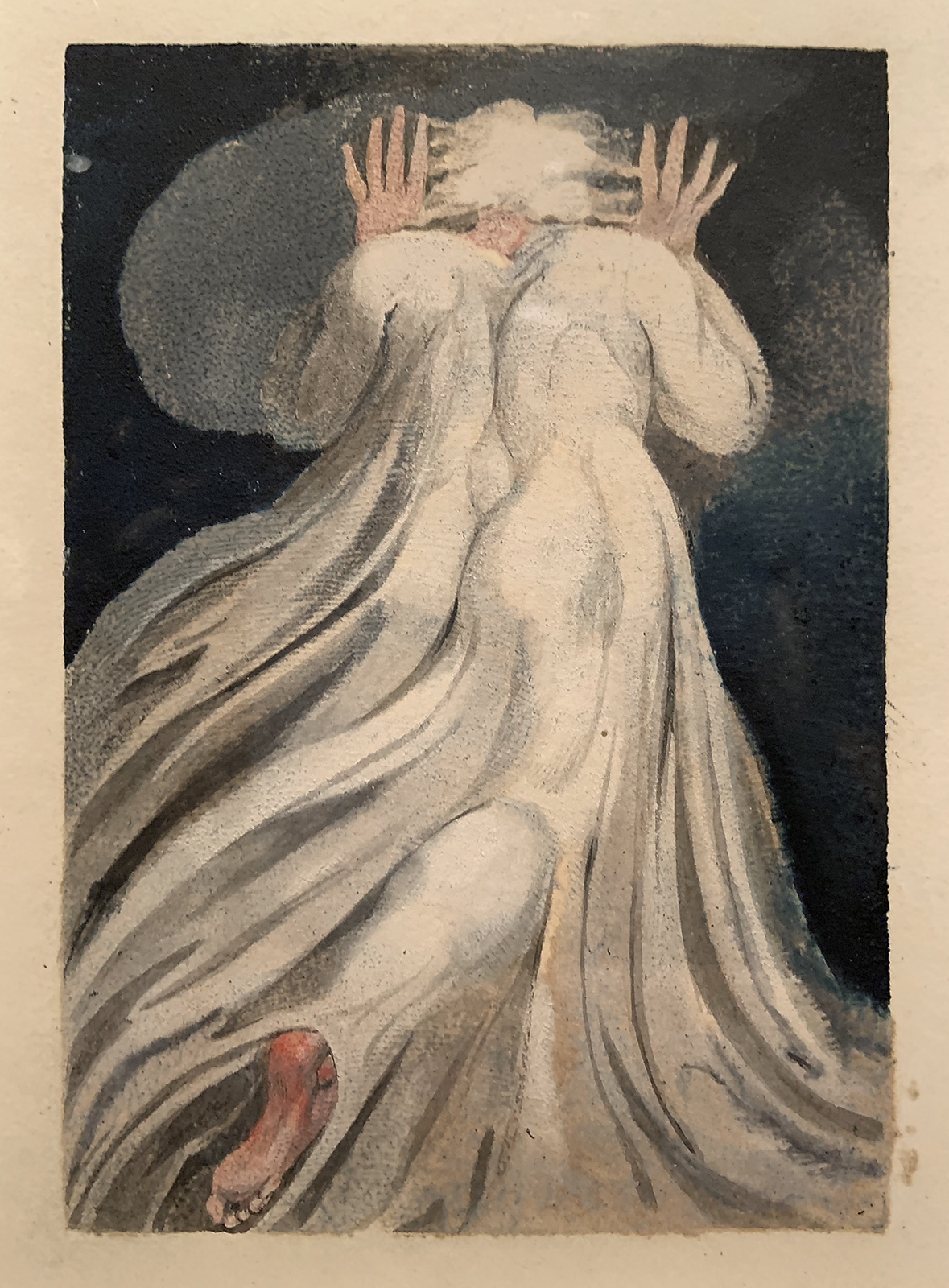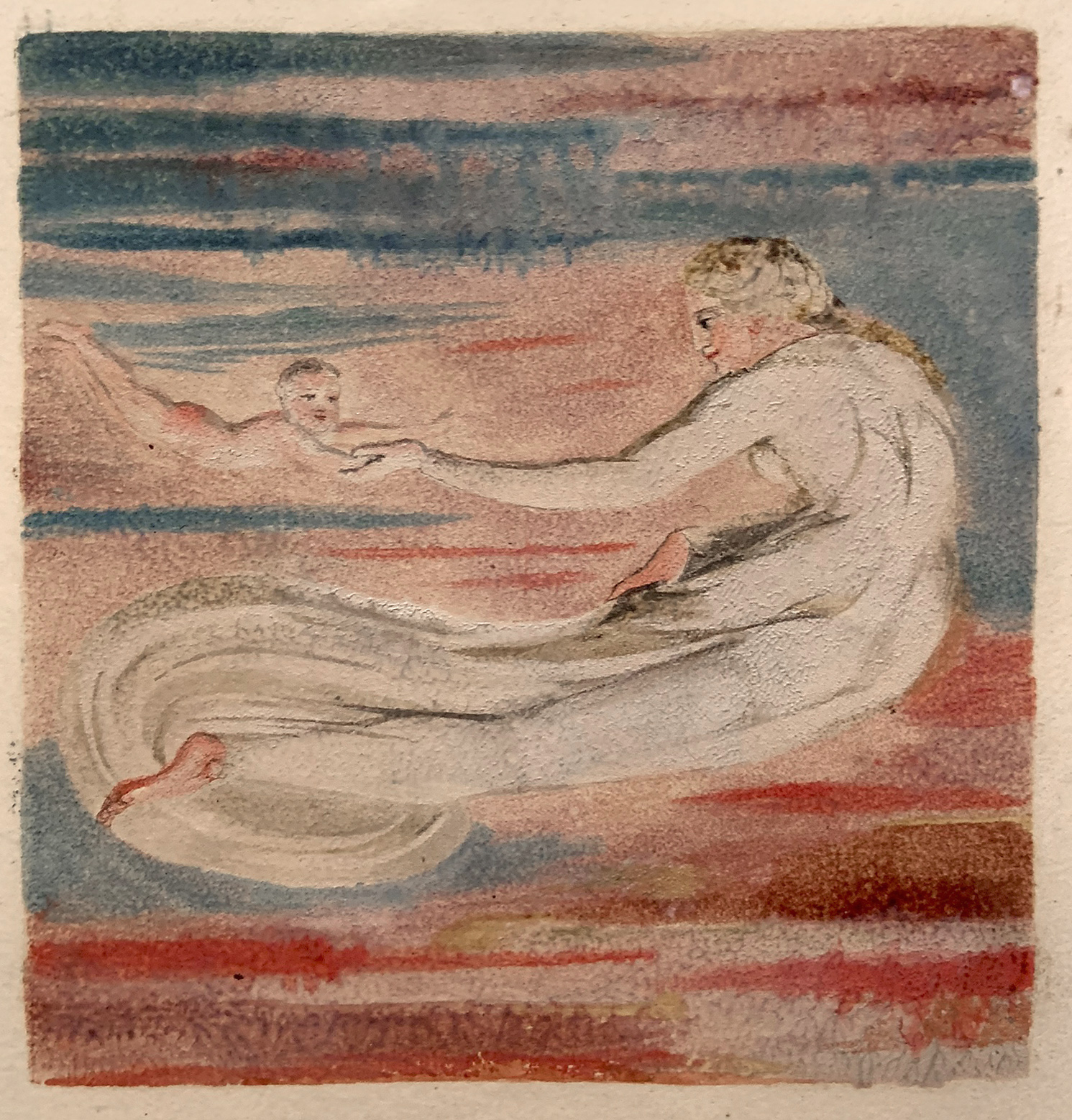 Blake started using more colours in the mid-1780s. The mysterious subject matter of this design is new as well. The title is not the artist’s own. It was added by later commentators, as is often the case with Blake’s symbolic designs.