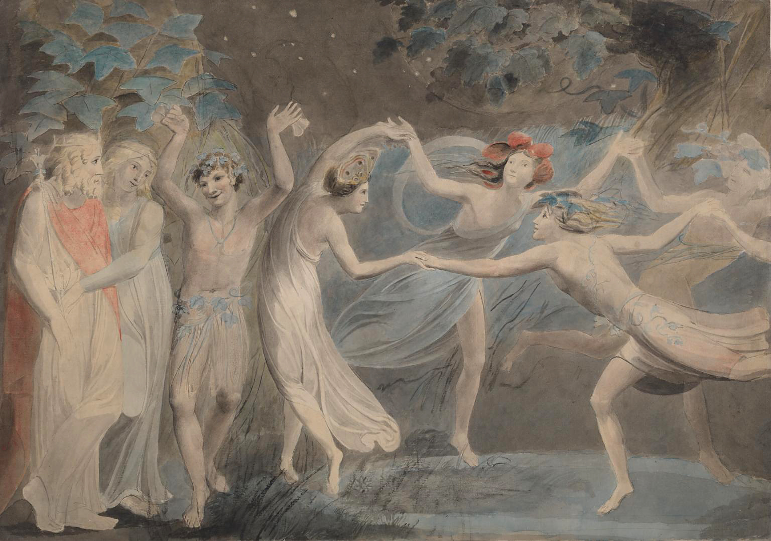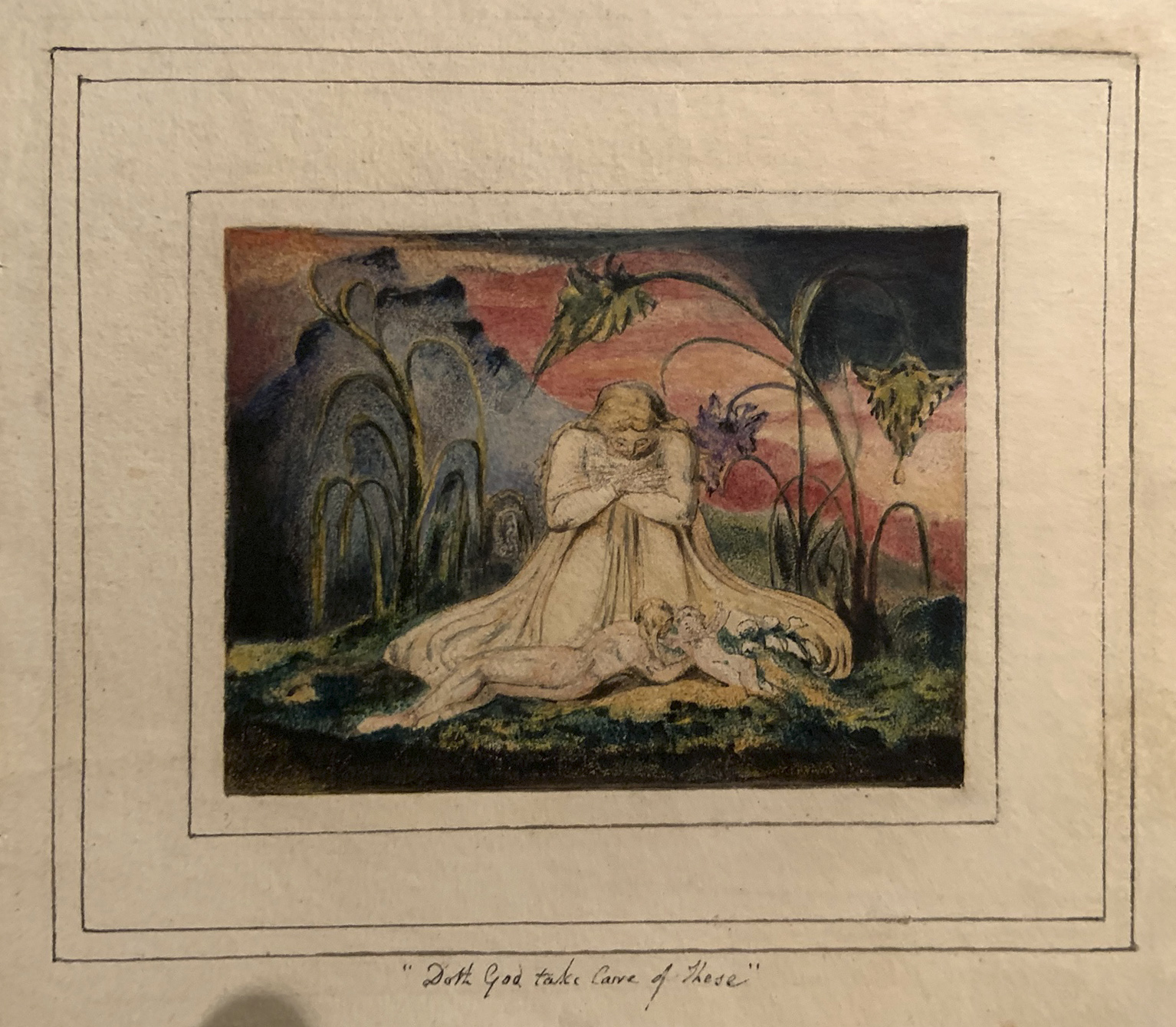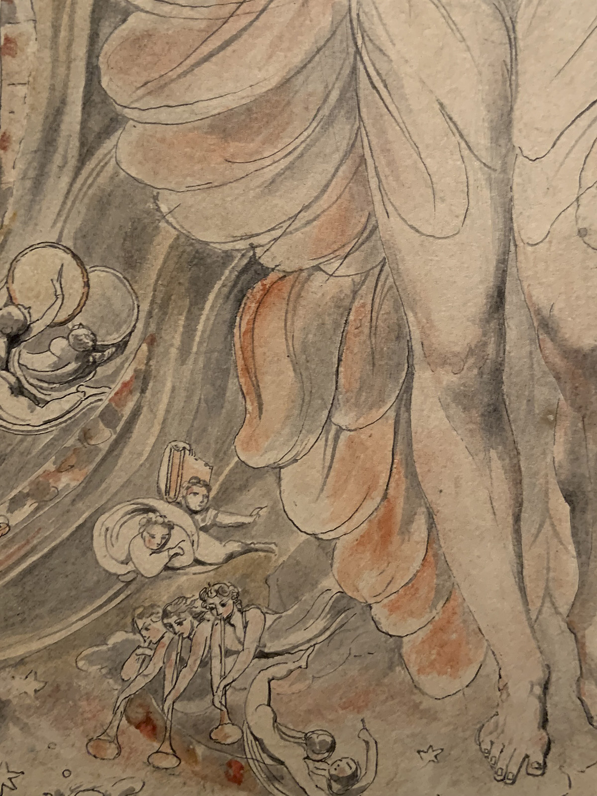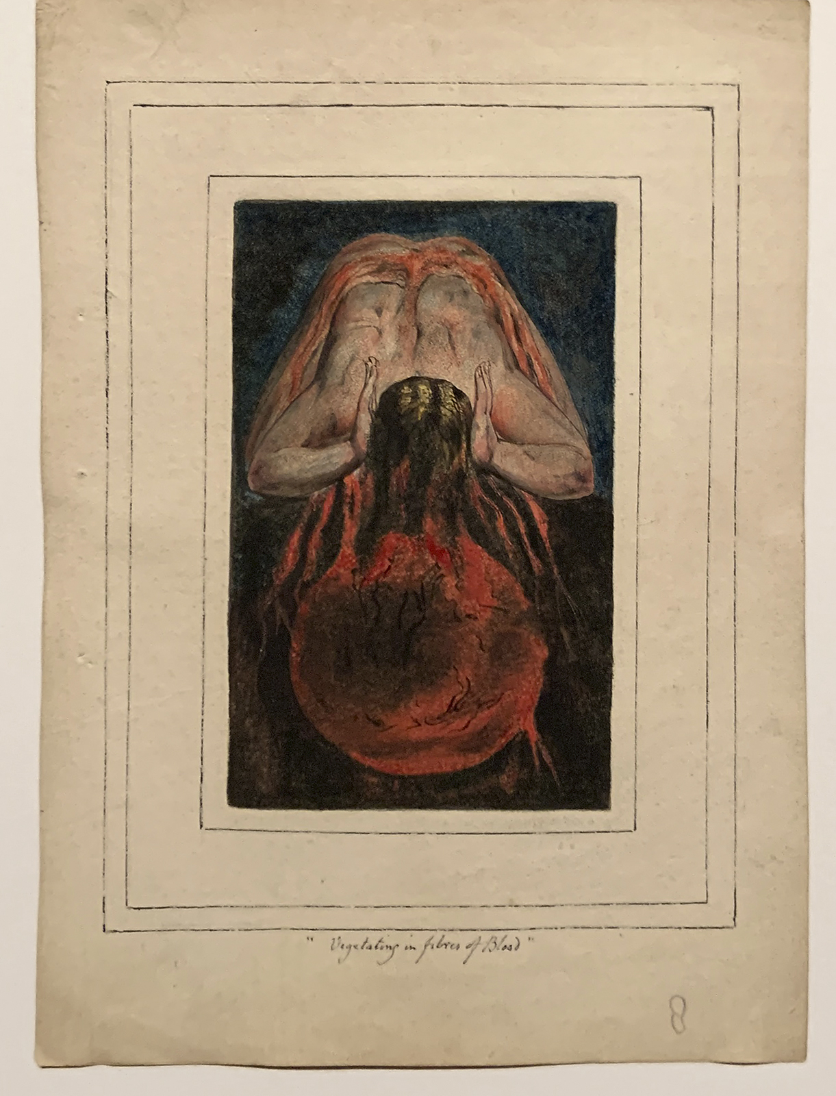 Blake started using more colours in the mid-1780s. The mysterious subject matter of this design is new as well. The title is not the artist’s own. It was added by later commentators, as is often the case with Blake’s symbolic designs.